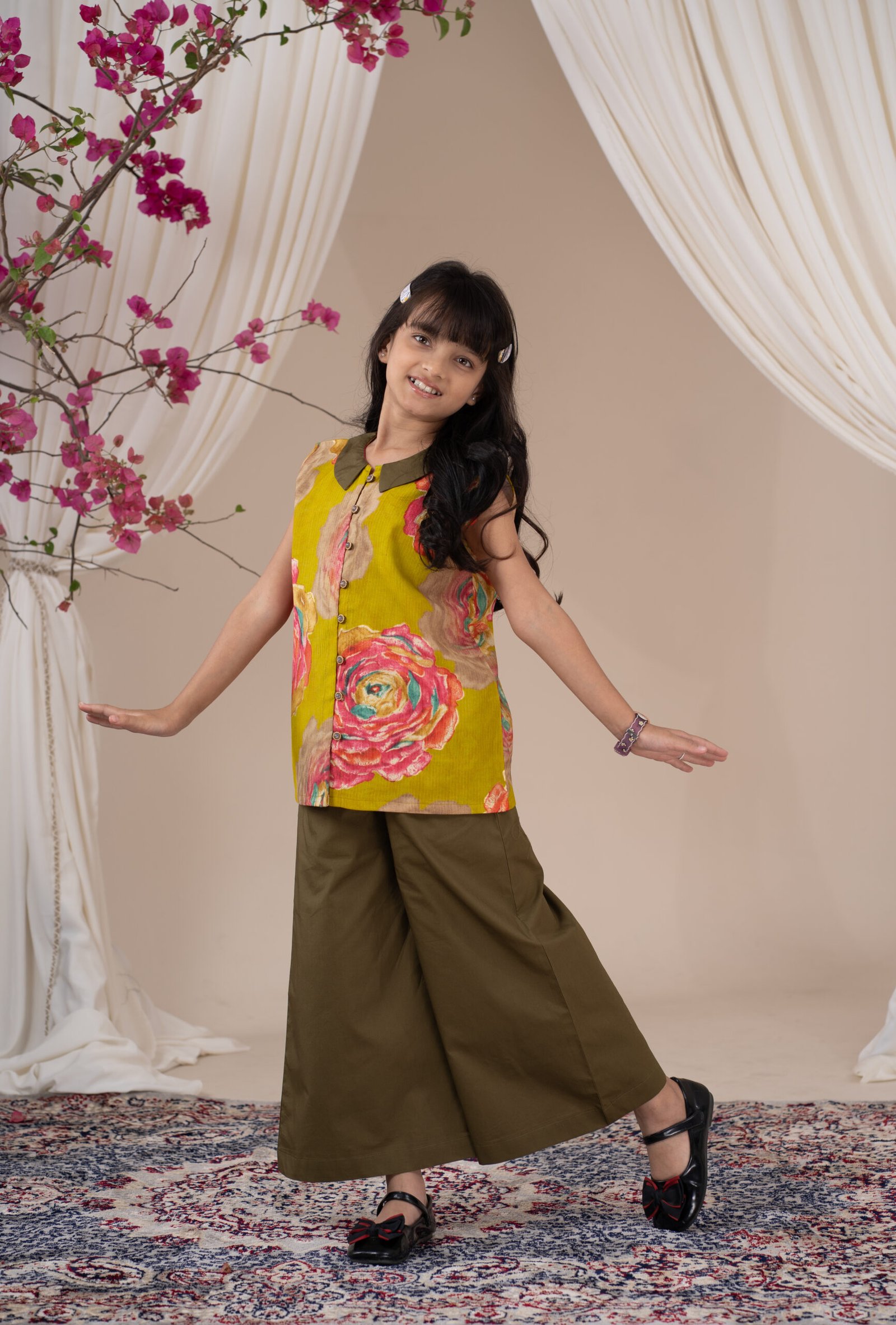 Little Girl’s Yellow Floral Sleeveless Peter Pan Collar Top with Olive Green Palazzo Pants Stylish Kids Two Piece Set