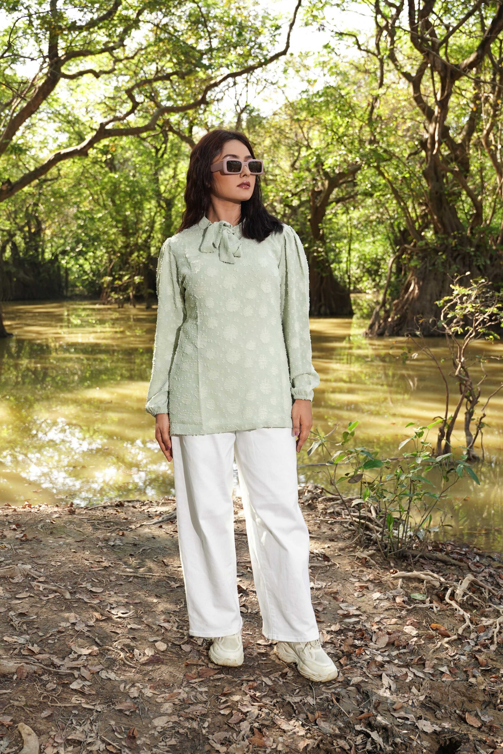 Elevate your everyday style with this Elegant Bow-Tie Neck Chiffon Top, designed for women who love soft, feminine, and effortlessly classy fashion. Tailored from lightweight textured chiffon, this top features subtle floral patterns that add depth and a premium touch. The bow-tie neckline enhances the chic and graceful look, making it perfect for outings, lunches, office wear, or any casual-smart occasion.