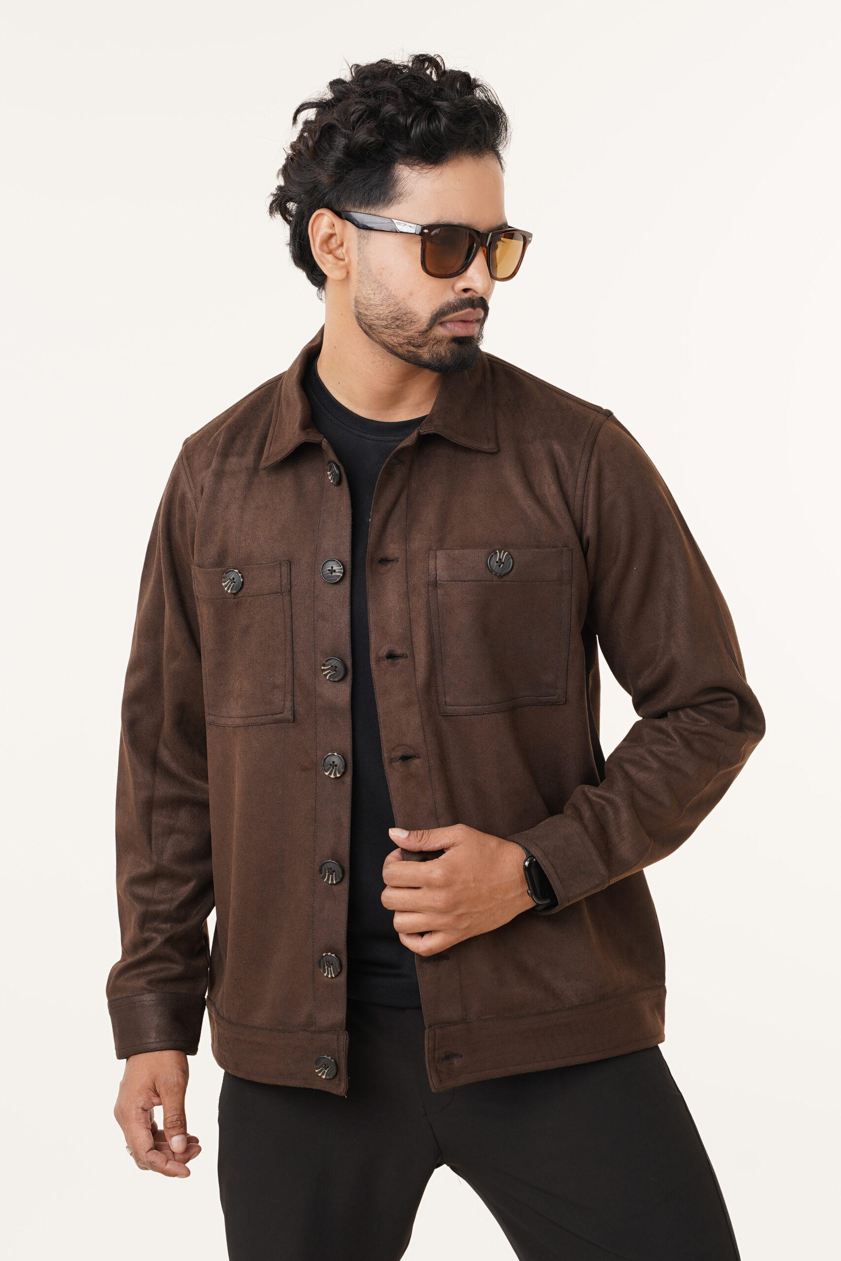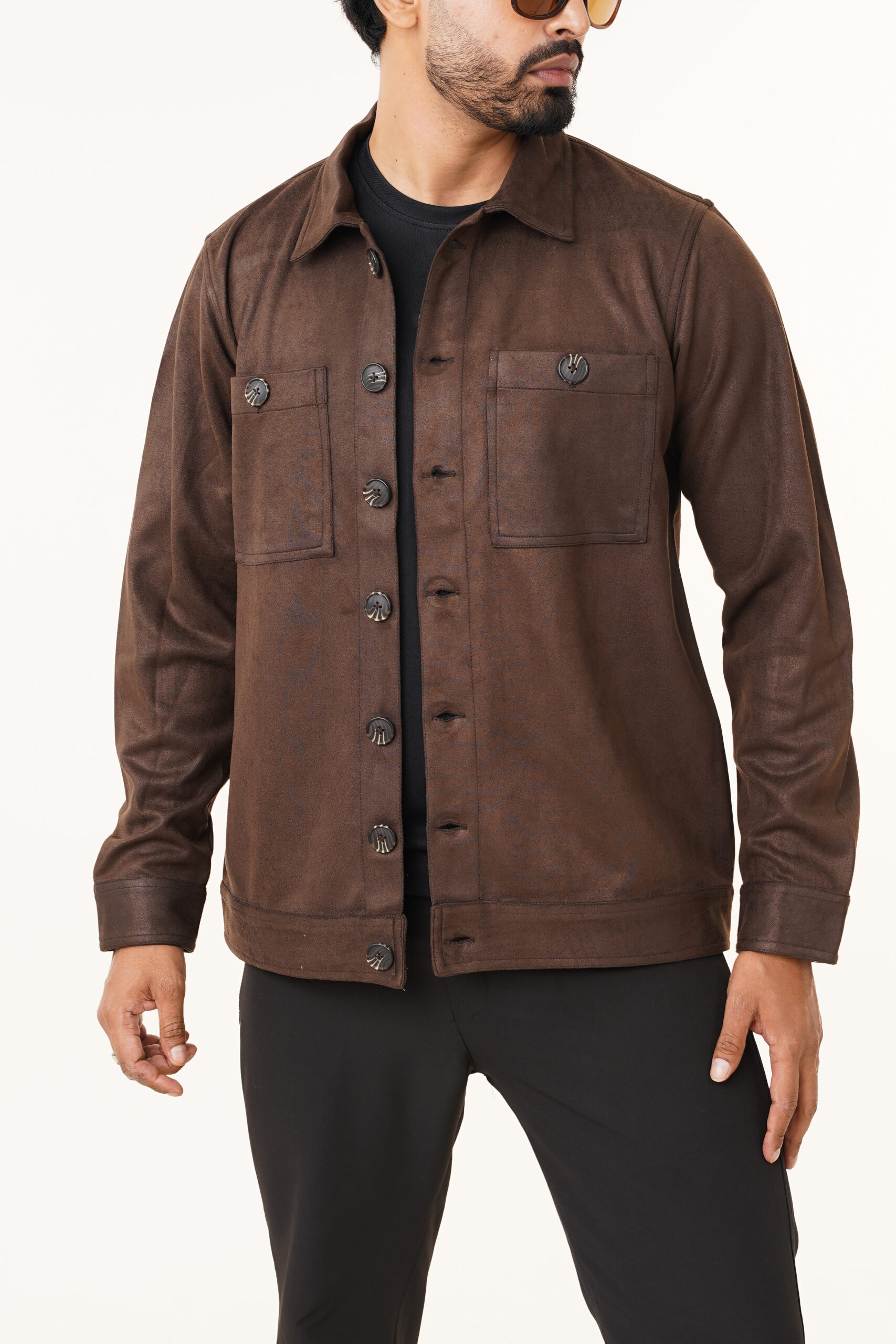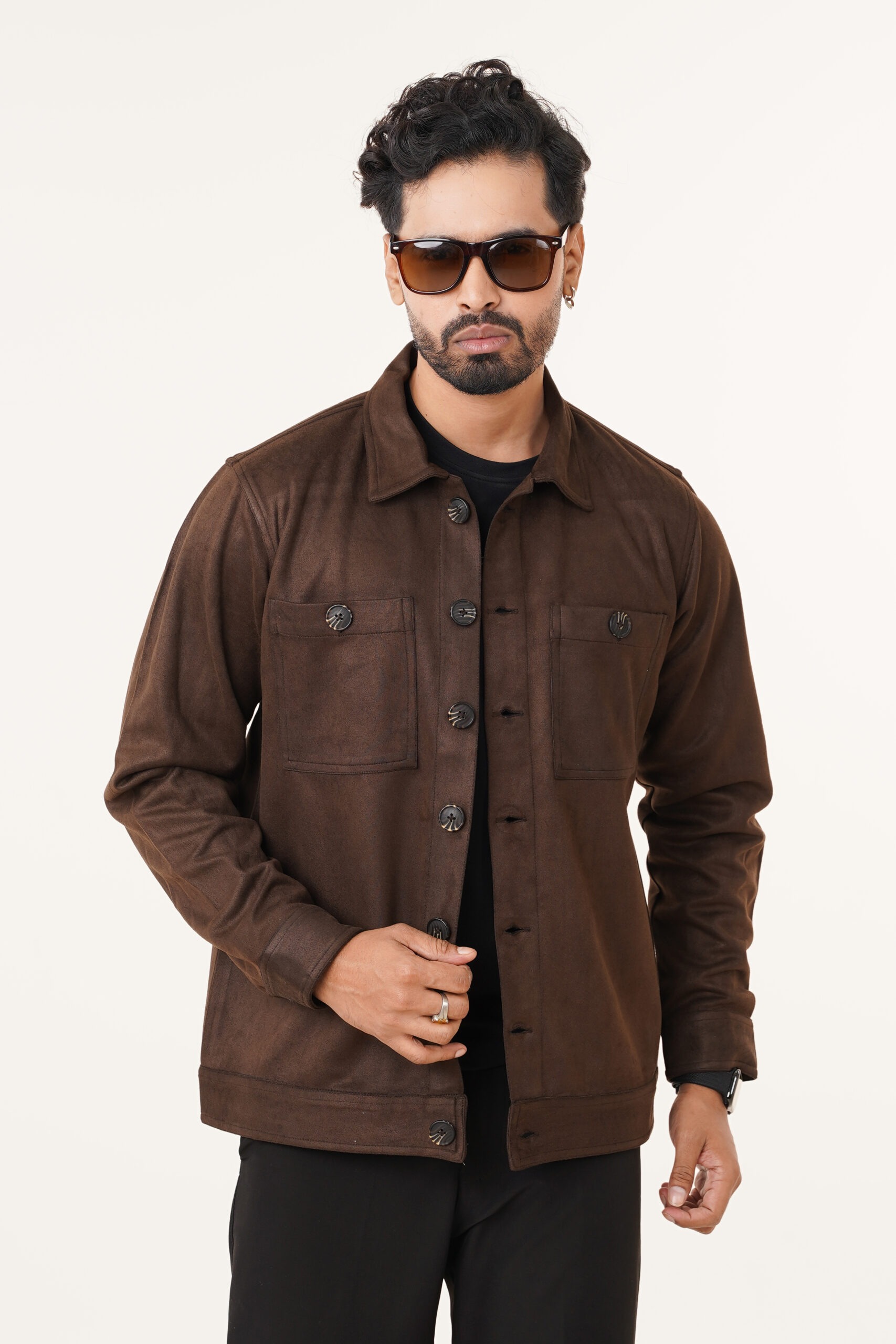 The jacket features a soft suede-finish fabric that offers a rich texture and a premium look without compromising on comfort. Its structured silhouette provides a clean and confident appearance, while the classic button-front closure ensures ease of wear and timeless appeal. Dual chest pockets with button flaps enhance both functionality and visual symmetry, adding a subtle utility-inspired edge.