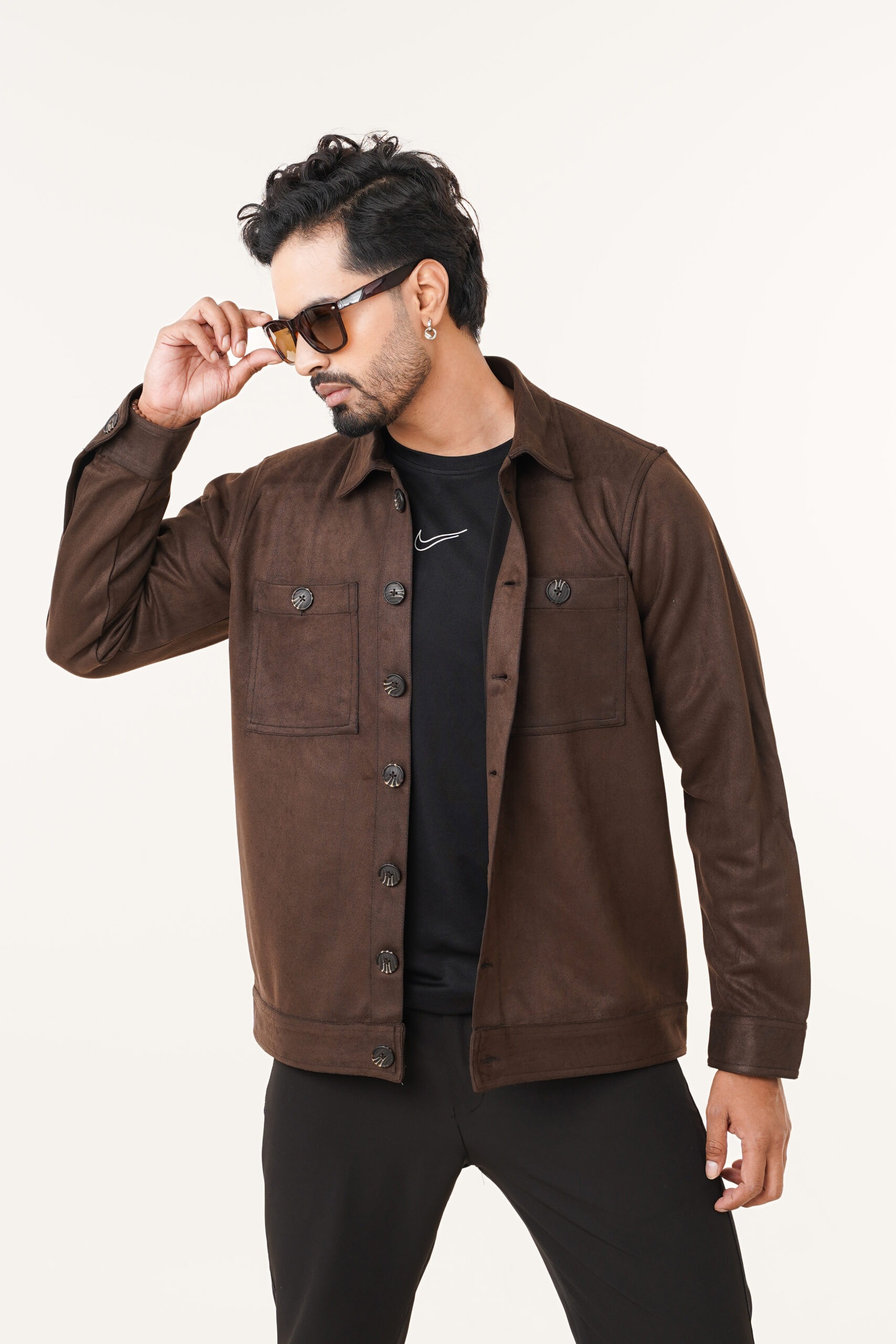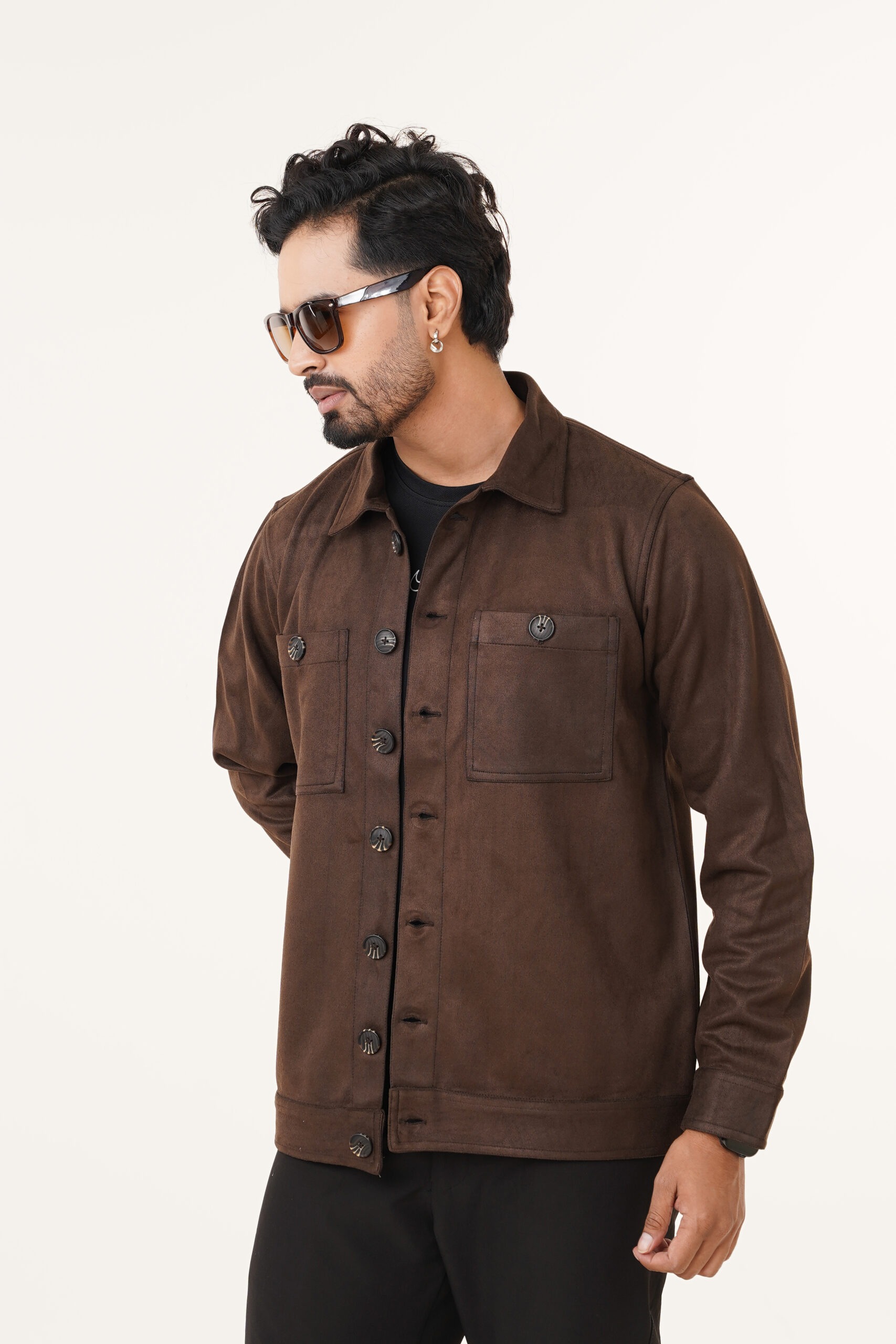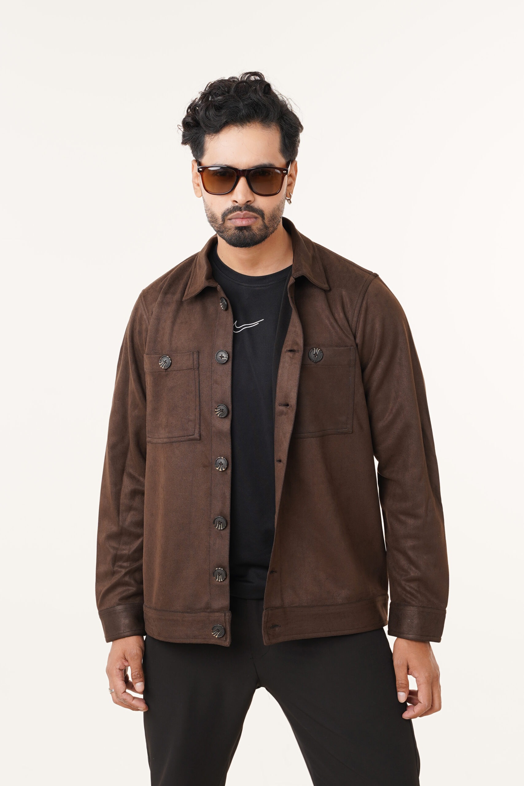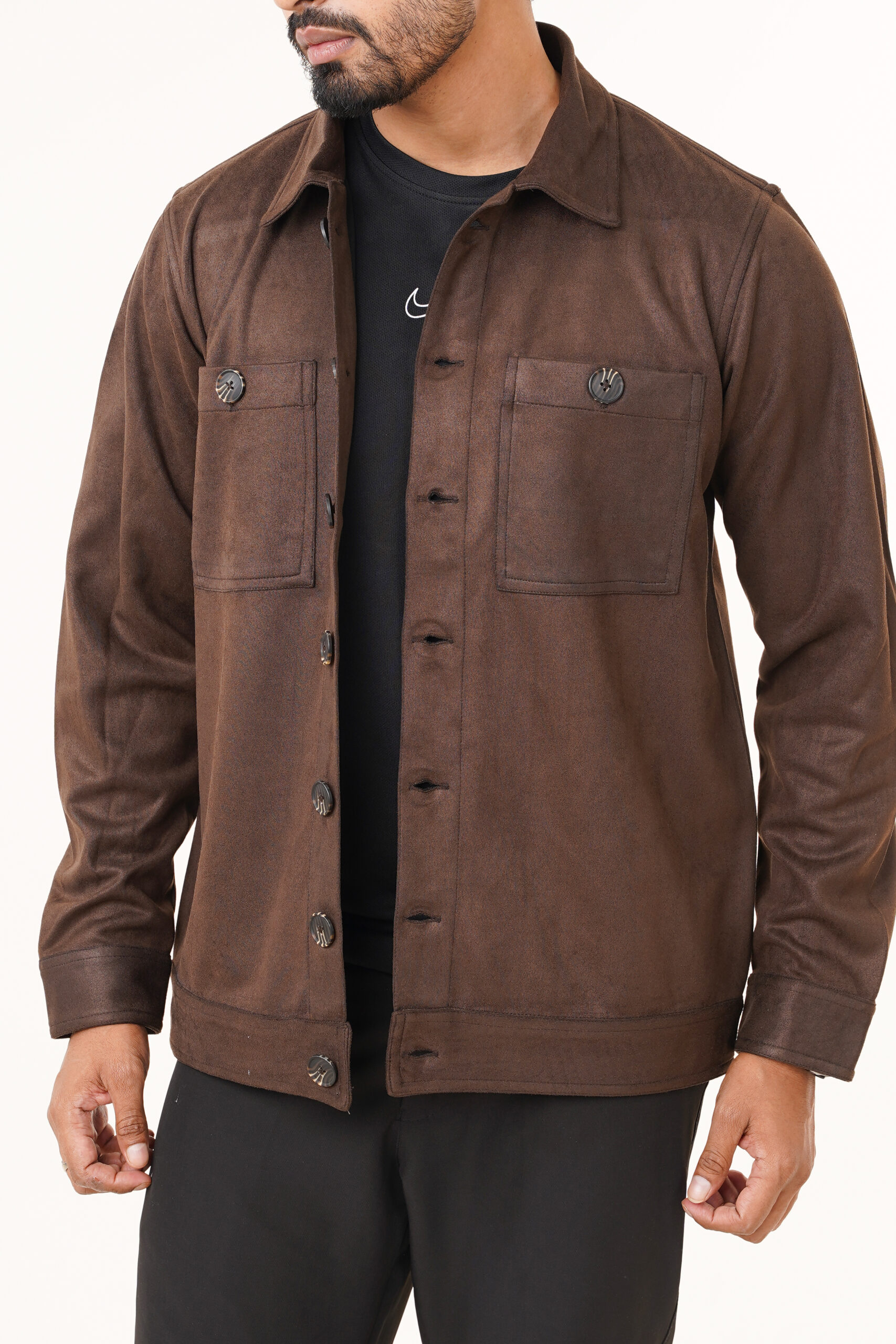 The jacket features a soft suede-finish fabric that offers a rich texture and a premium look without compromising on comfort. Its structured silhouette provides a clean and confident appearance, while the classic button-front closure ensures ease of wear and timeless appeal. Dual chest pockets with button flaps enhance both functionality and visual symmetry, adding a subtle utility-inspired edge.