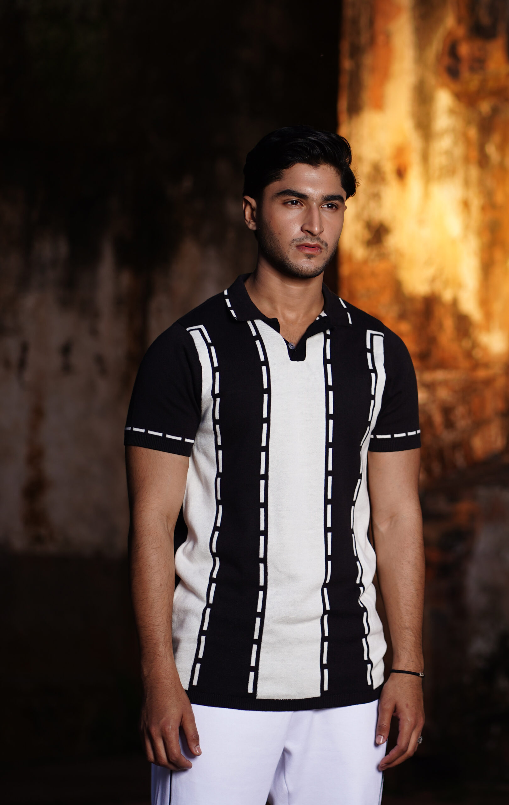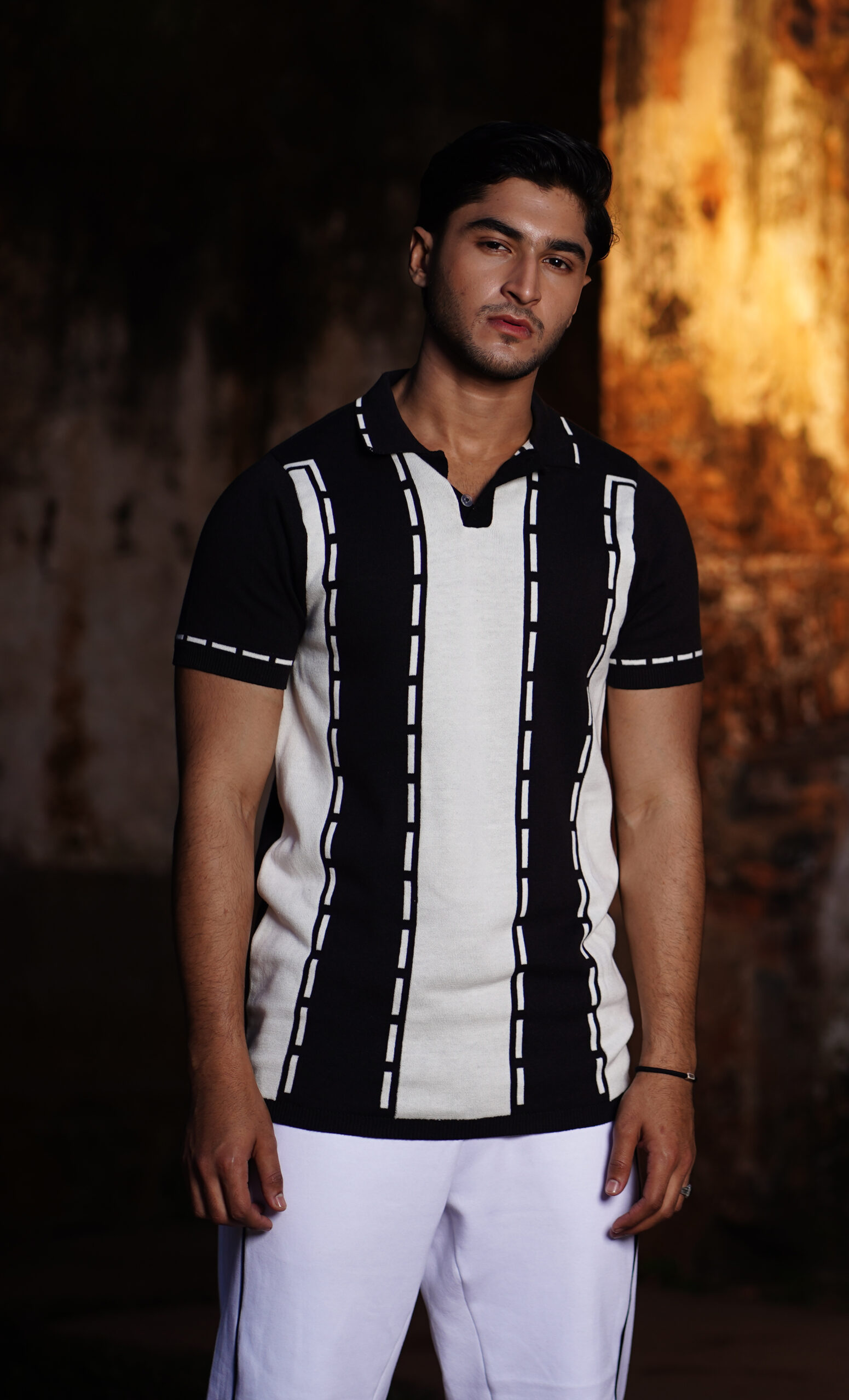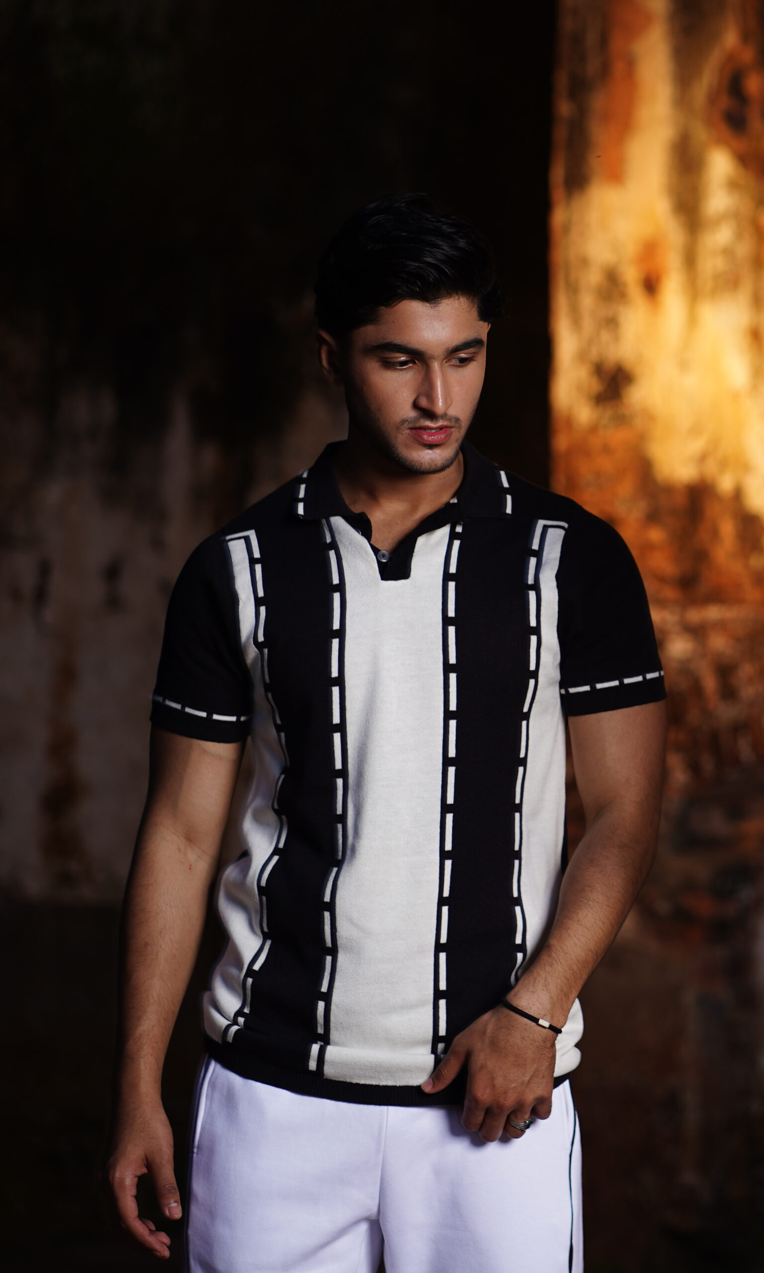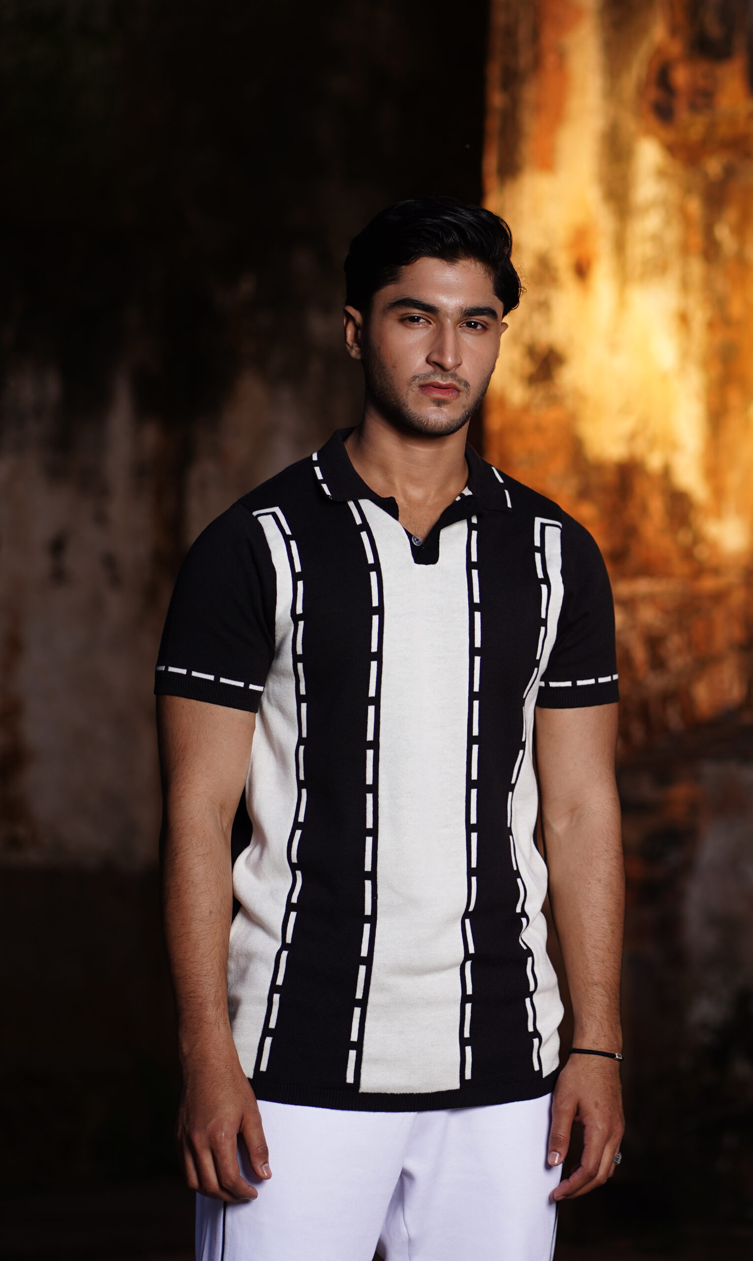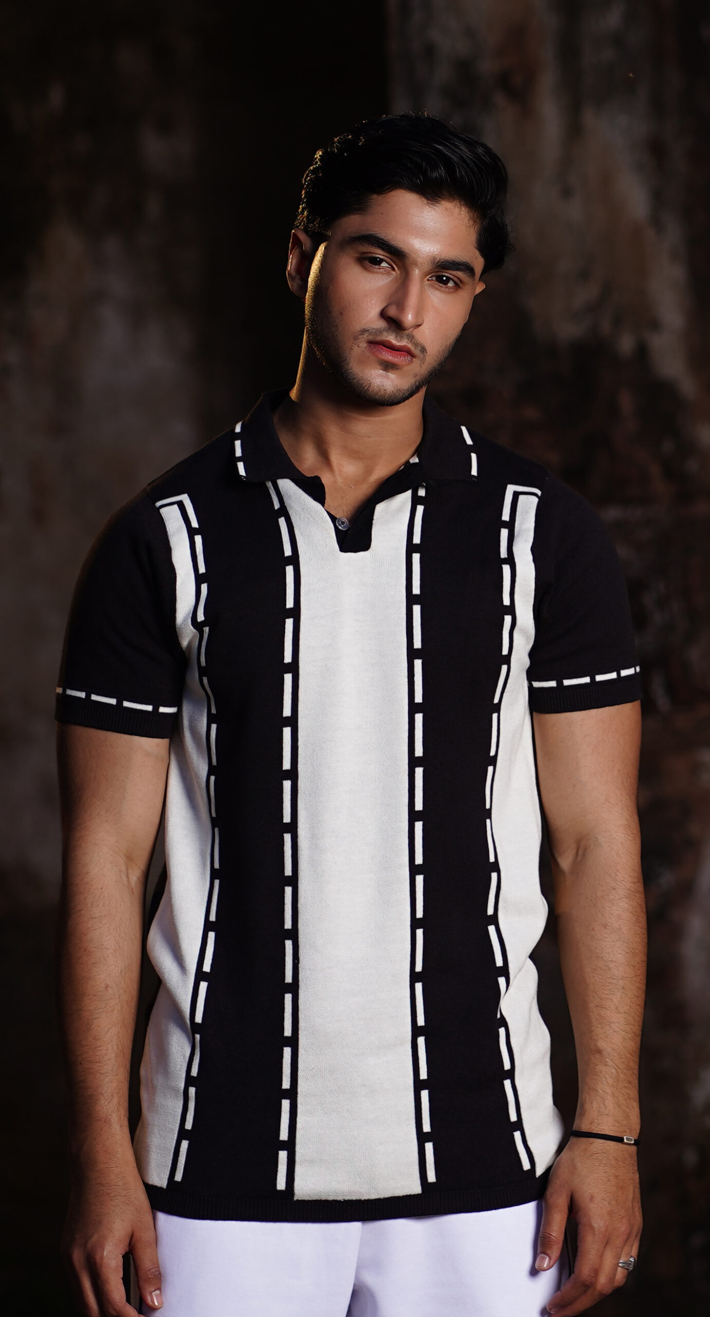 Modern Textured Short Sleeve Shirt Men’s Black & White Contrast Knit Modern Slim Fit Polo