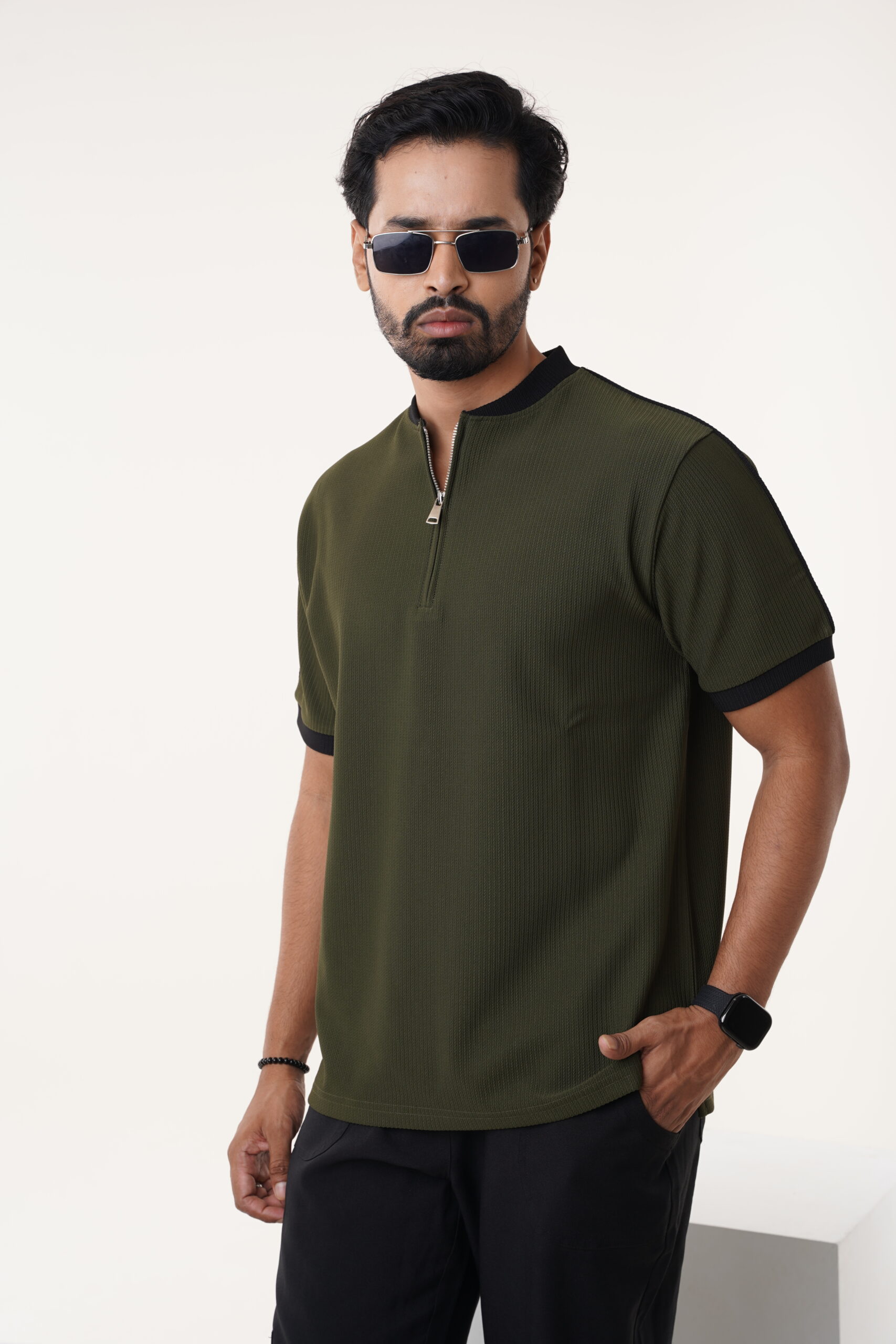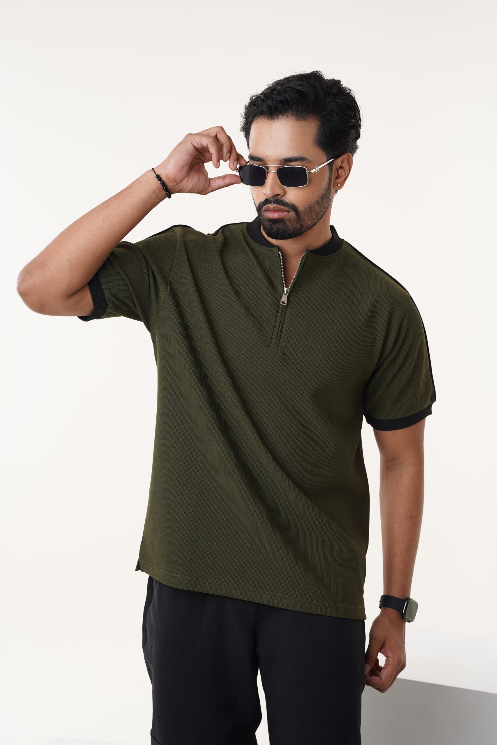 Modern Contrast Ribbed Trims Fashion Half Zip Neckline Premium Fabric Blend Men’s Streetwear Casual Polo