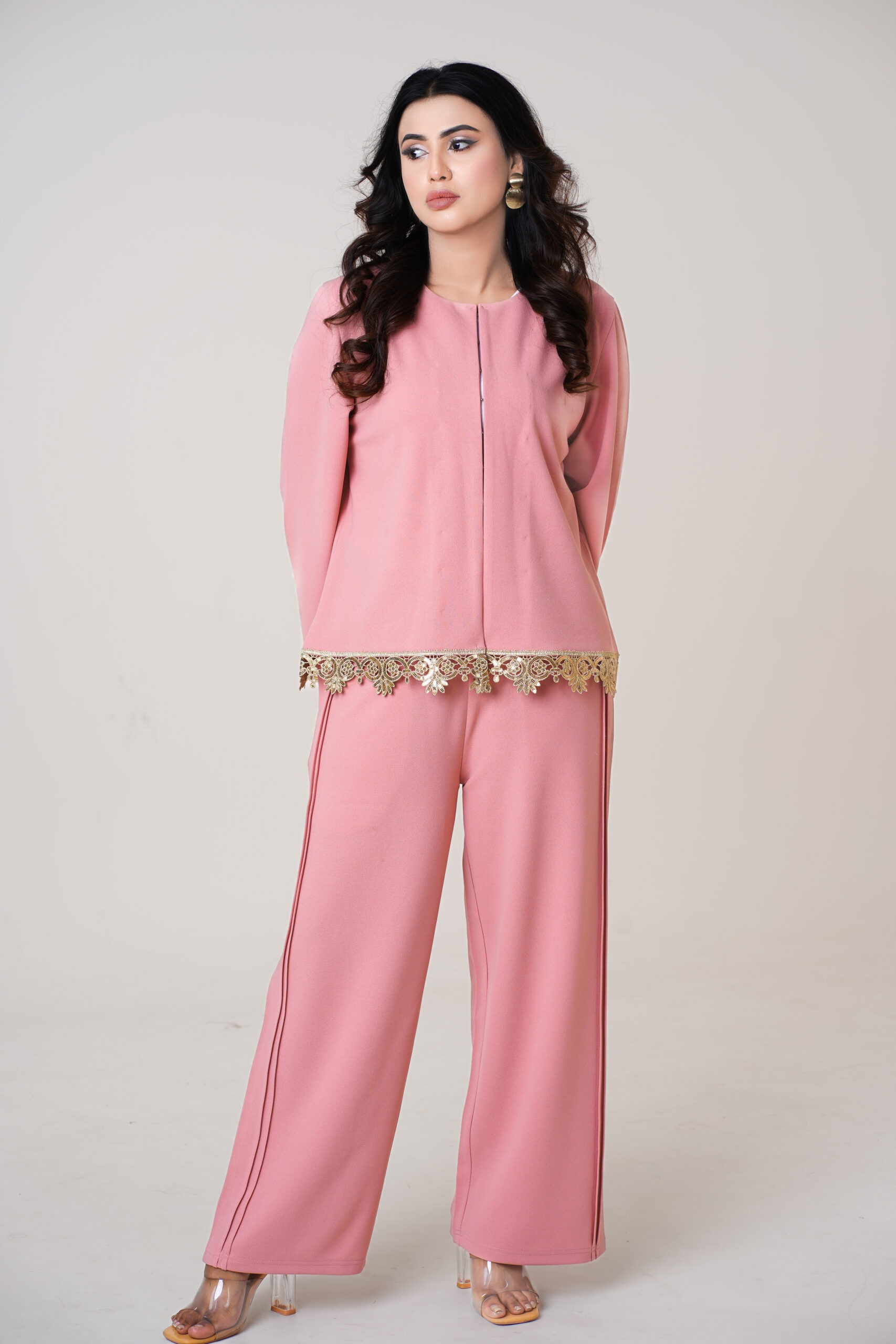 Modern Silhouette Premium Pink Lace Trim Suit Embroidered Co-Ord Set Flowy Top and Matching Bottoms