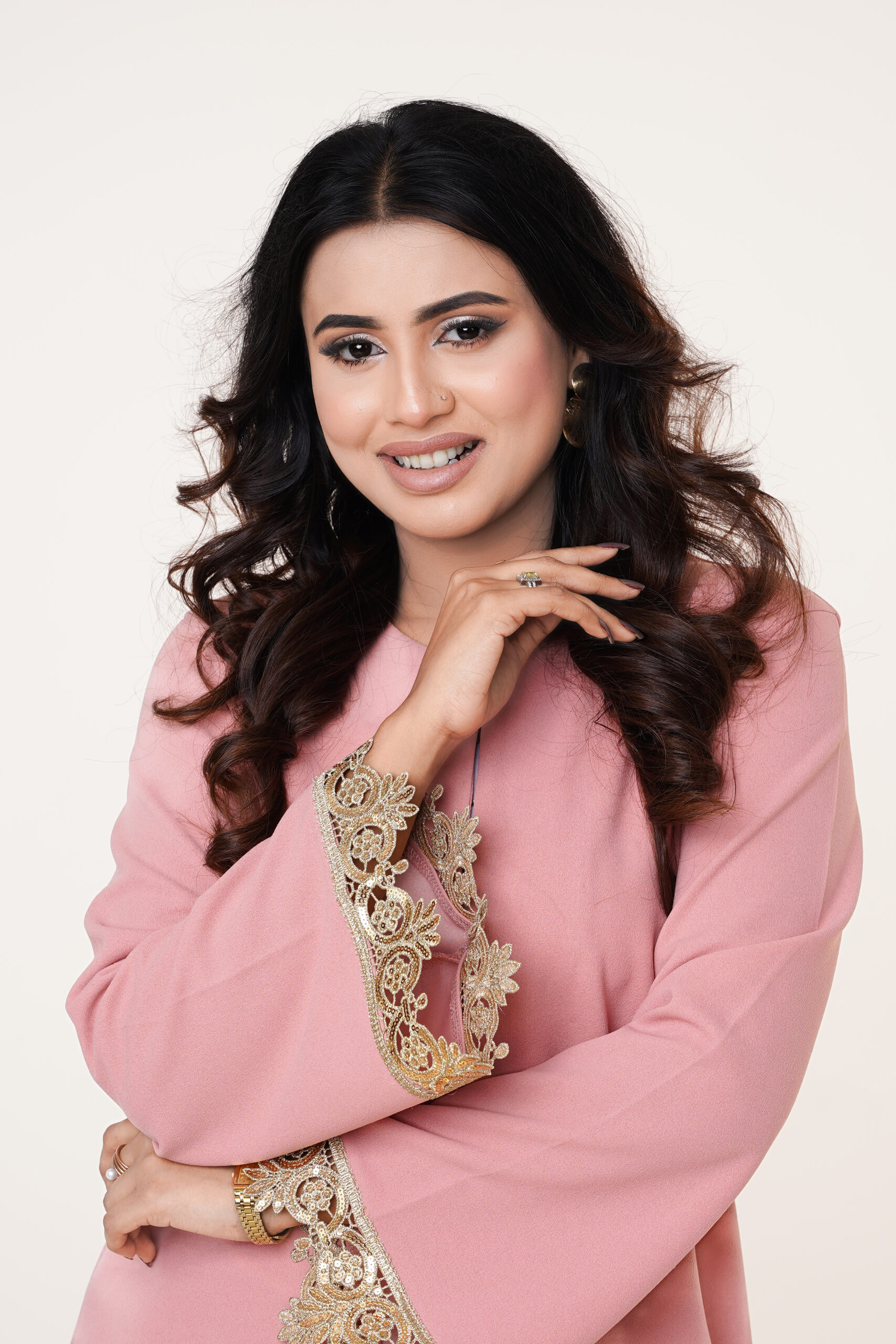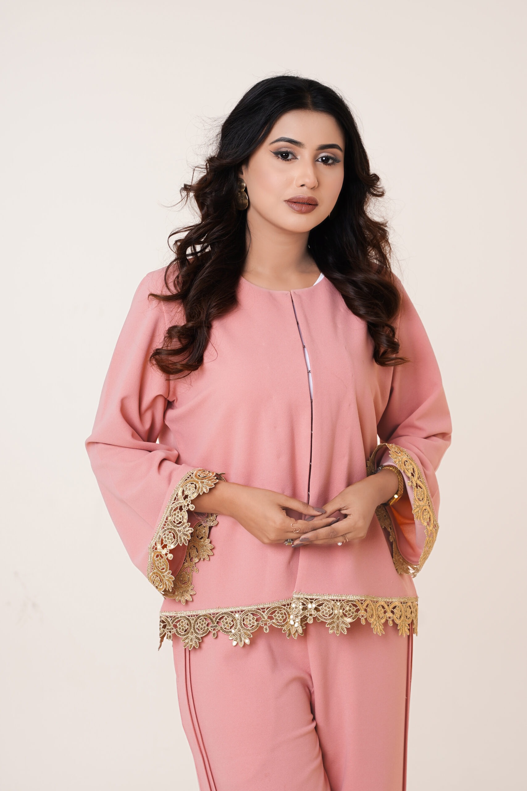 This beautiful two-piece set features a soft blush-pink top paired with matching trousers, creating a graceful, coordinated look. The highlight of the outfit is the intricate gold lace detailing along the hem and the wide bell sleeves, adding a luxurious touch that feels both regal and modern.