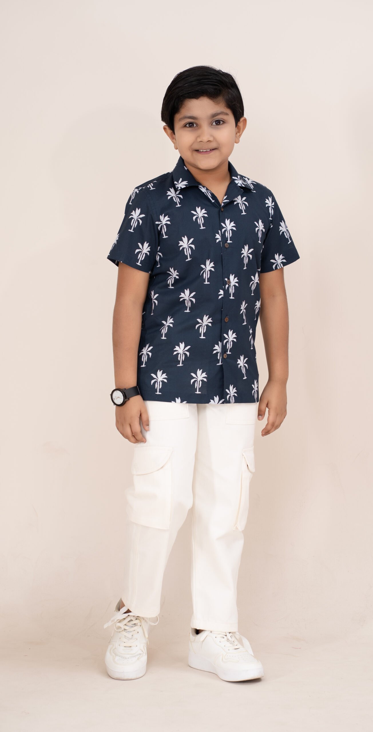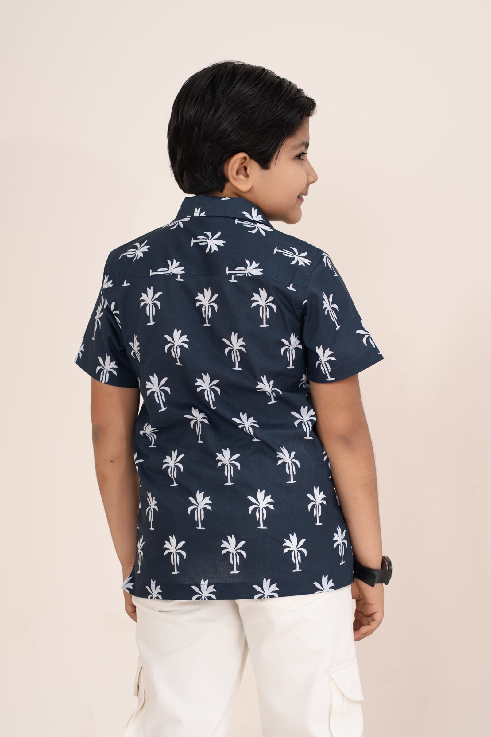 Bring a fresh tropical vibe to your child’s wardrobe with this Kids Navy Blue Palm Tree Printed Casual Shirt designed for comfort and playful style.