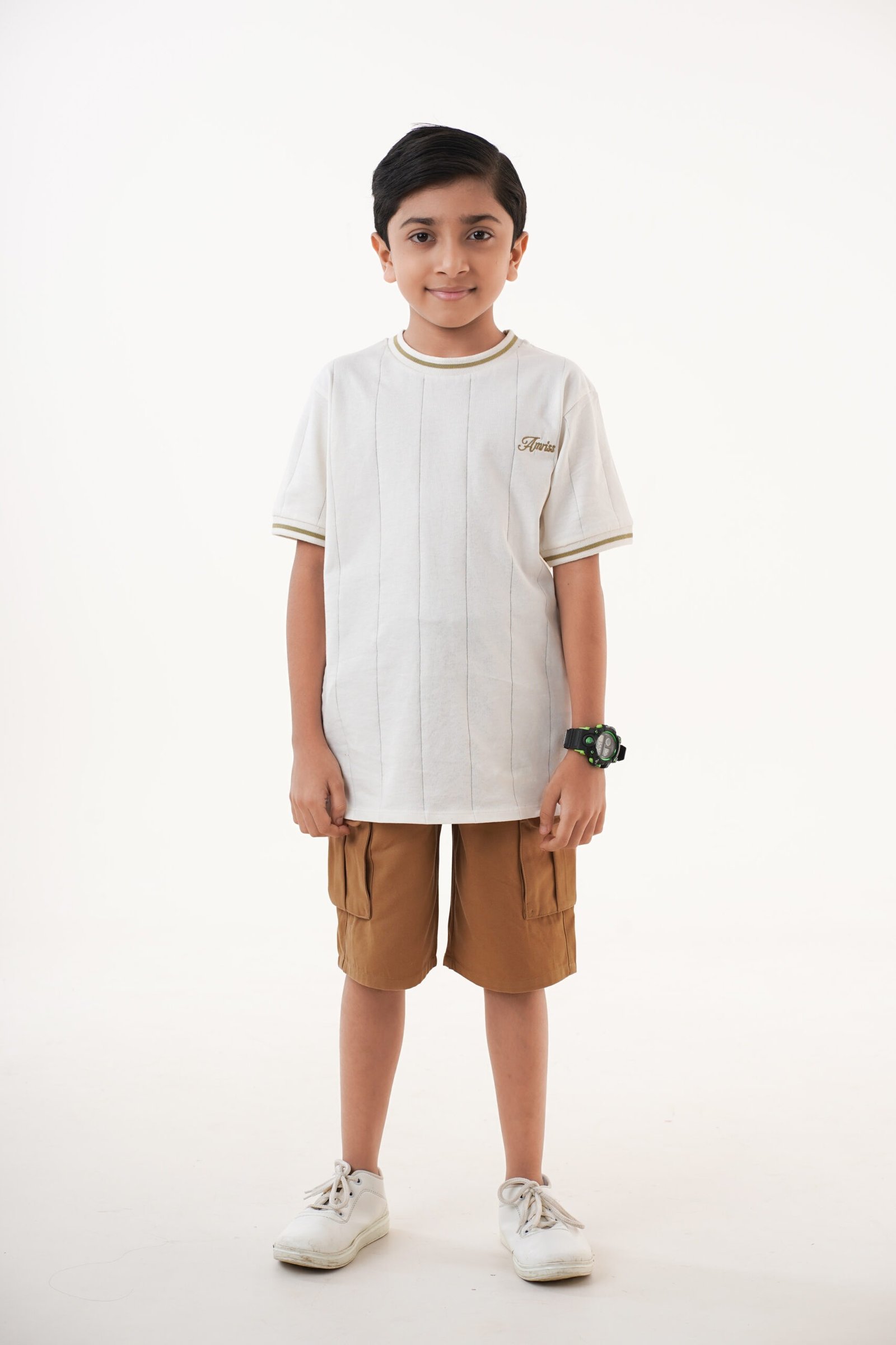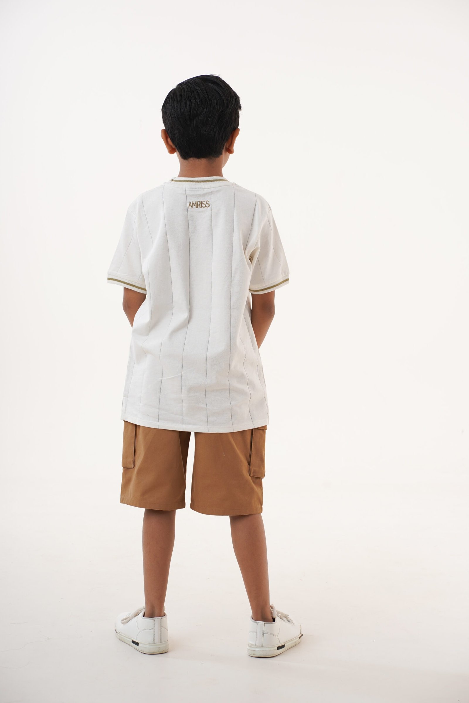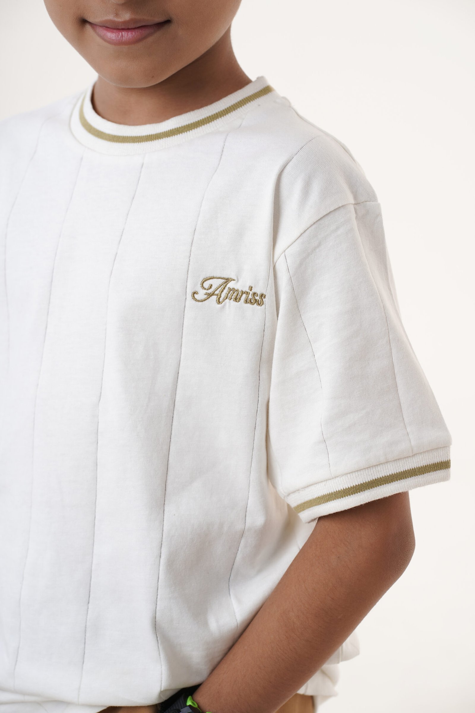 The Amriss Signature Kids Drop Needle Tee is crafted for boys who love effortless style. Its structured texture, soft-touch fabric, and clean white palette make it the perfect blend of comfort and elegance — a true representation of modern kidswear luxury.