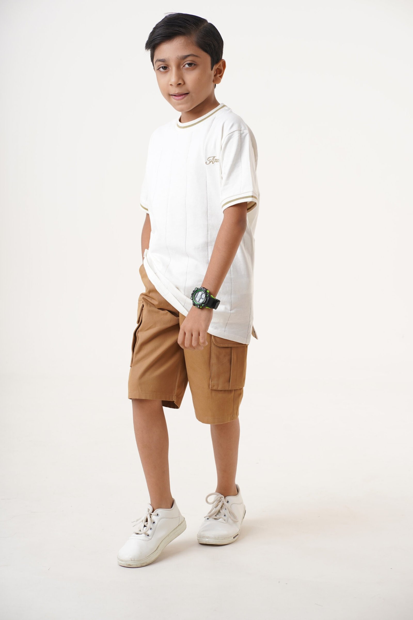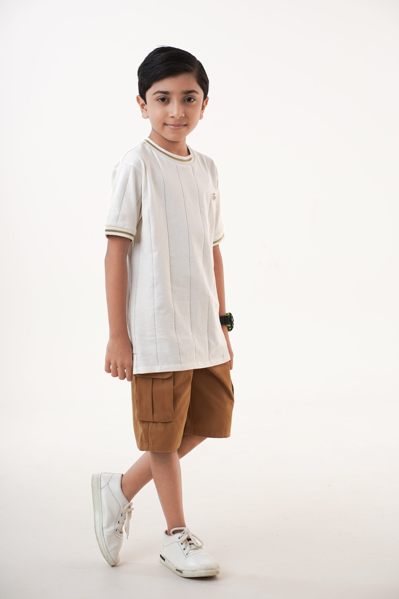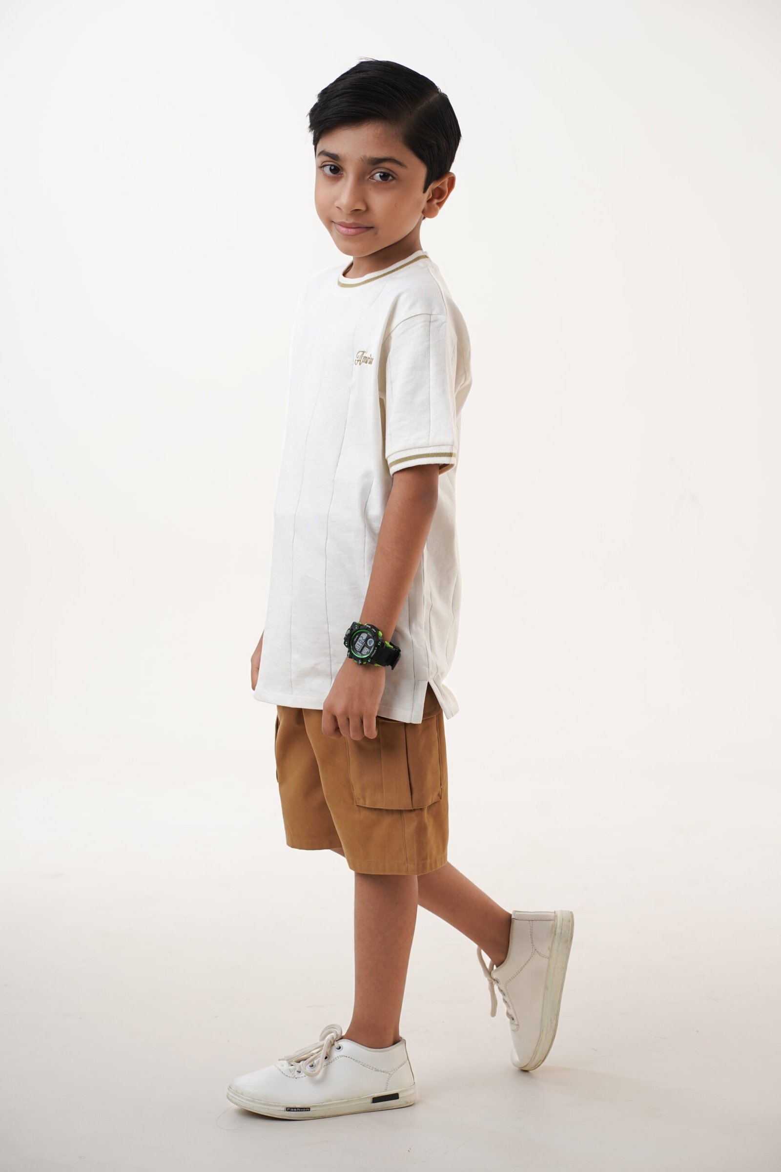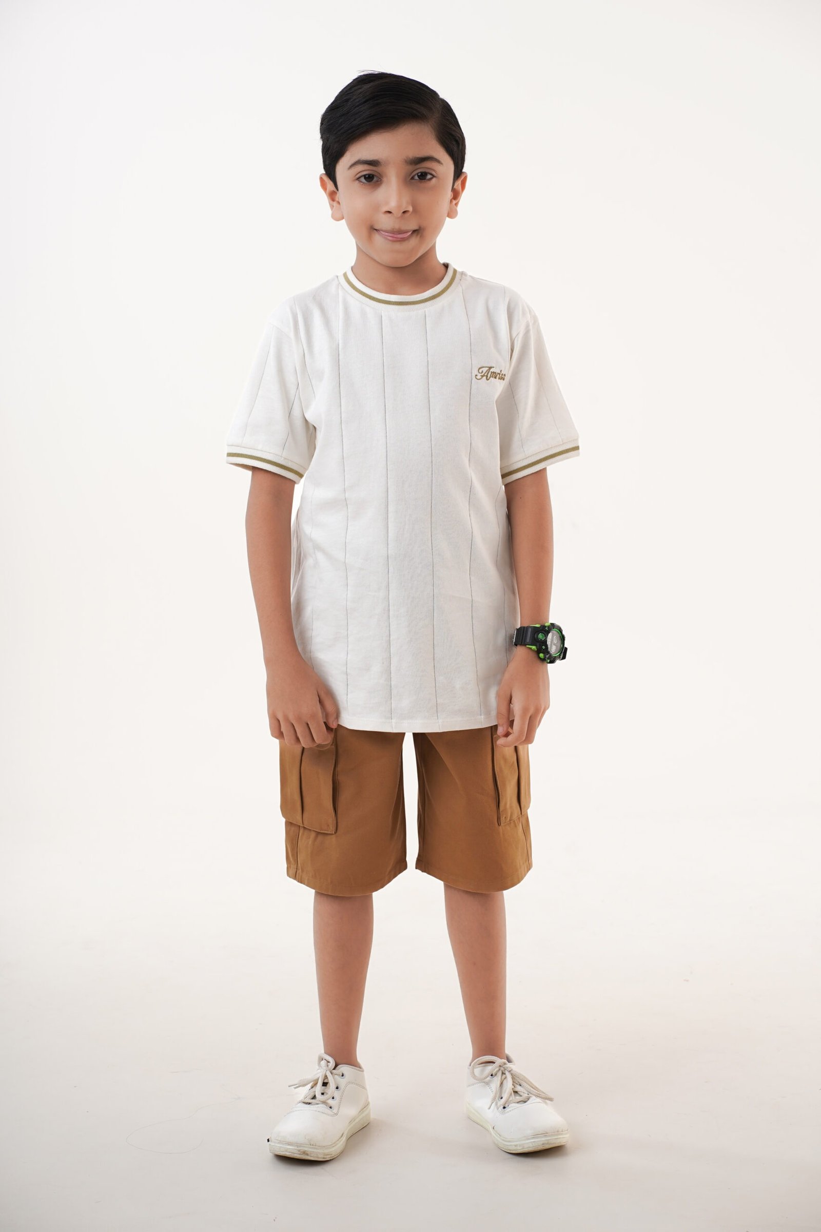 The Amriss Signature Kids Drop Needle Tee is crafted for boys who love effortless style. Its structured texture, soft-touch fabric, and clean white palette make it the perfect blend of comfort and elegance — a true representation of modern kidswear luxury.