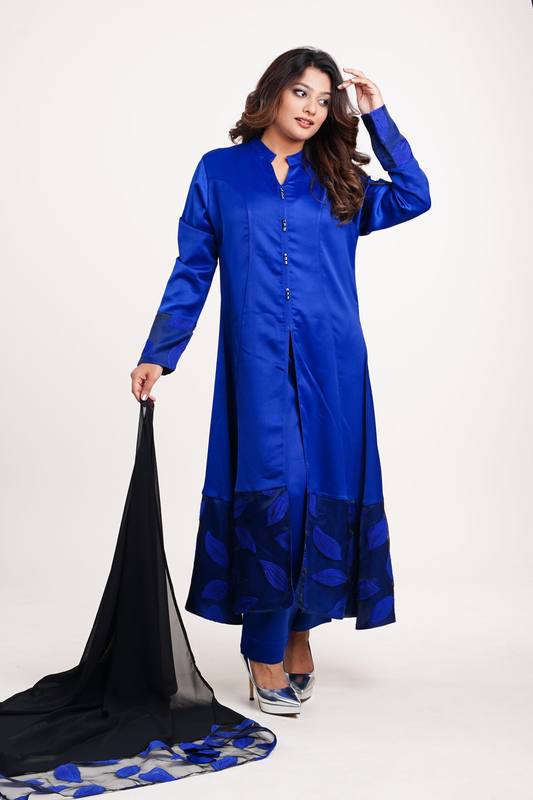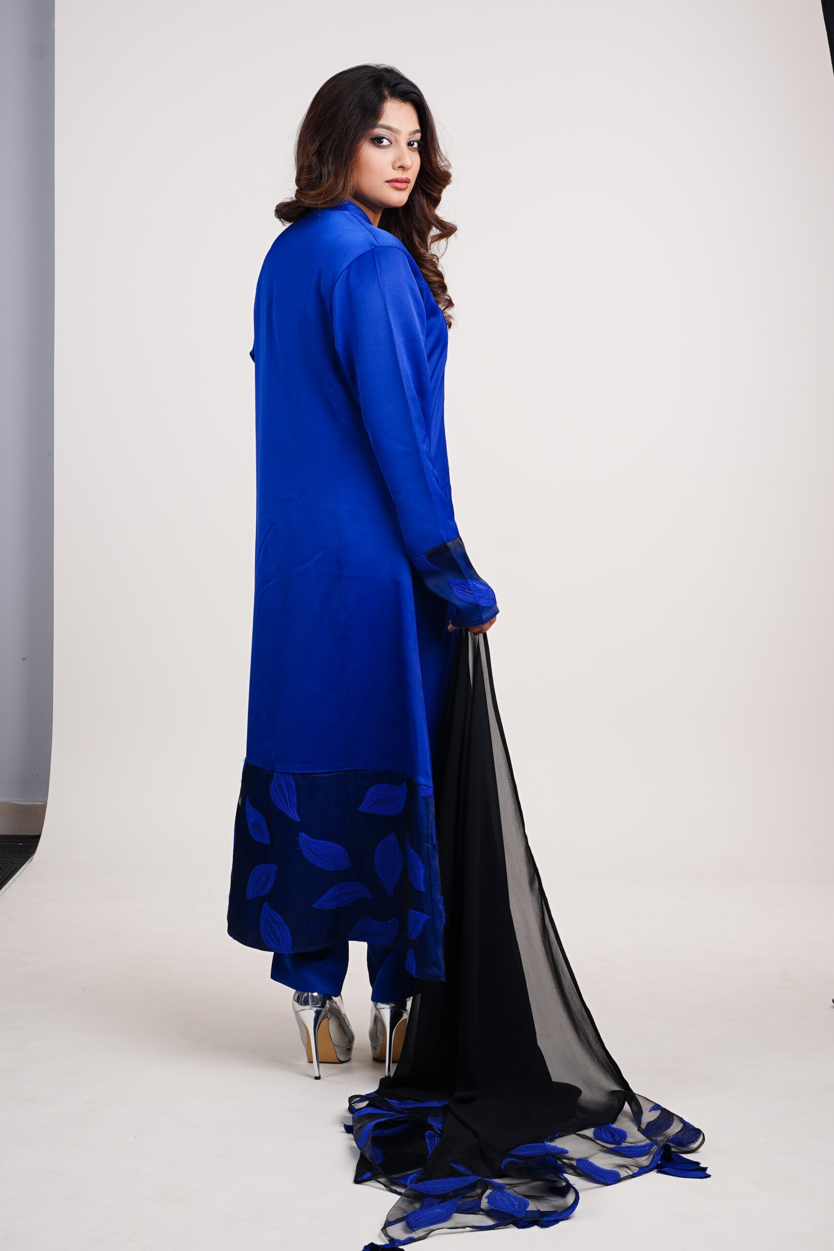 This elegant royal blue three-piece set is crafted from premium Arabian silk, offering a smooth texture subtle sheen and graceful drape. Designed for women who appreciate refined detailing and timeless silhouettes, this outfit presents a polished and luxurious appearance, perfect for special occasions.