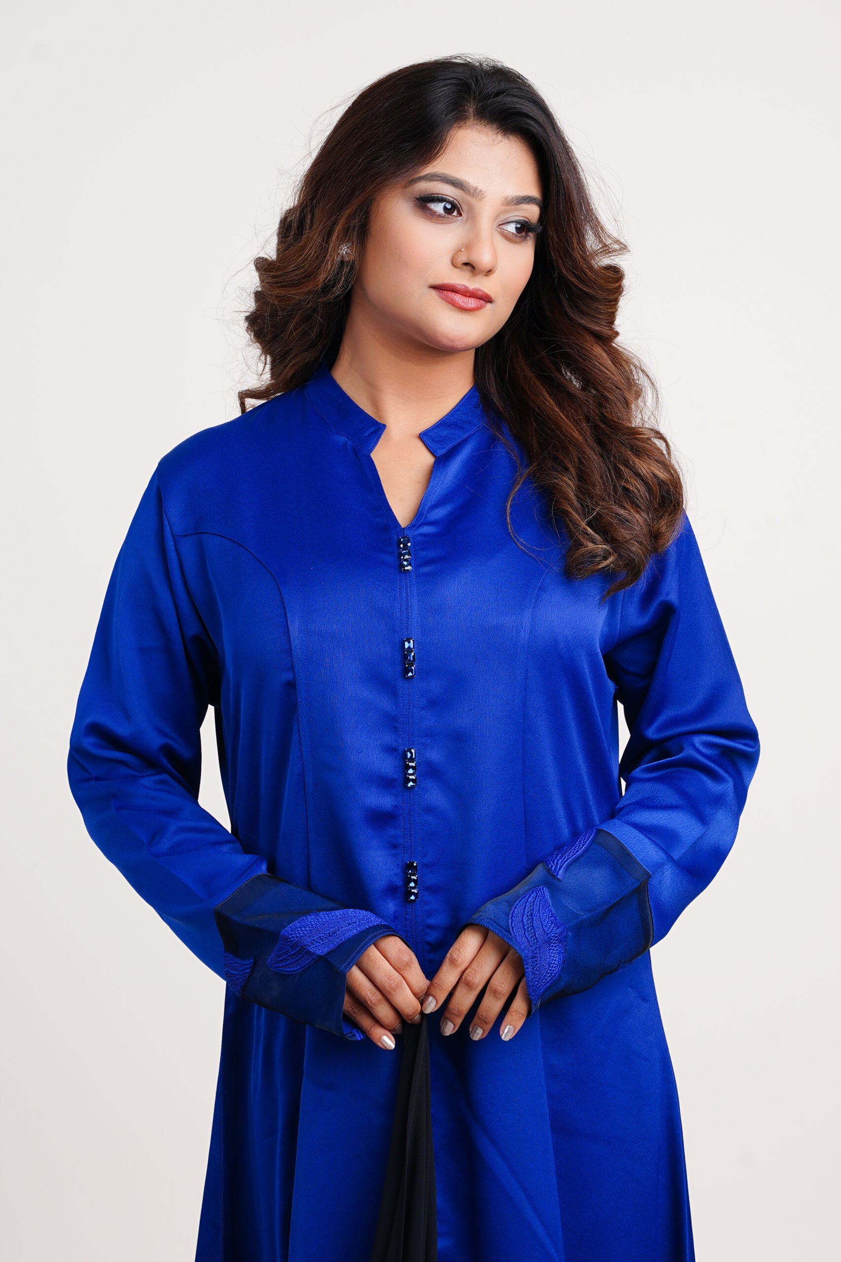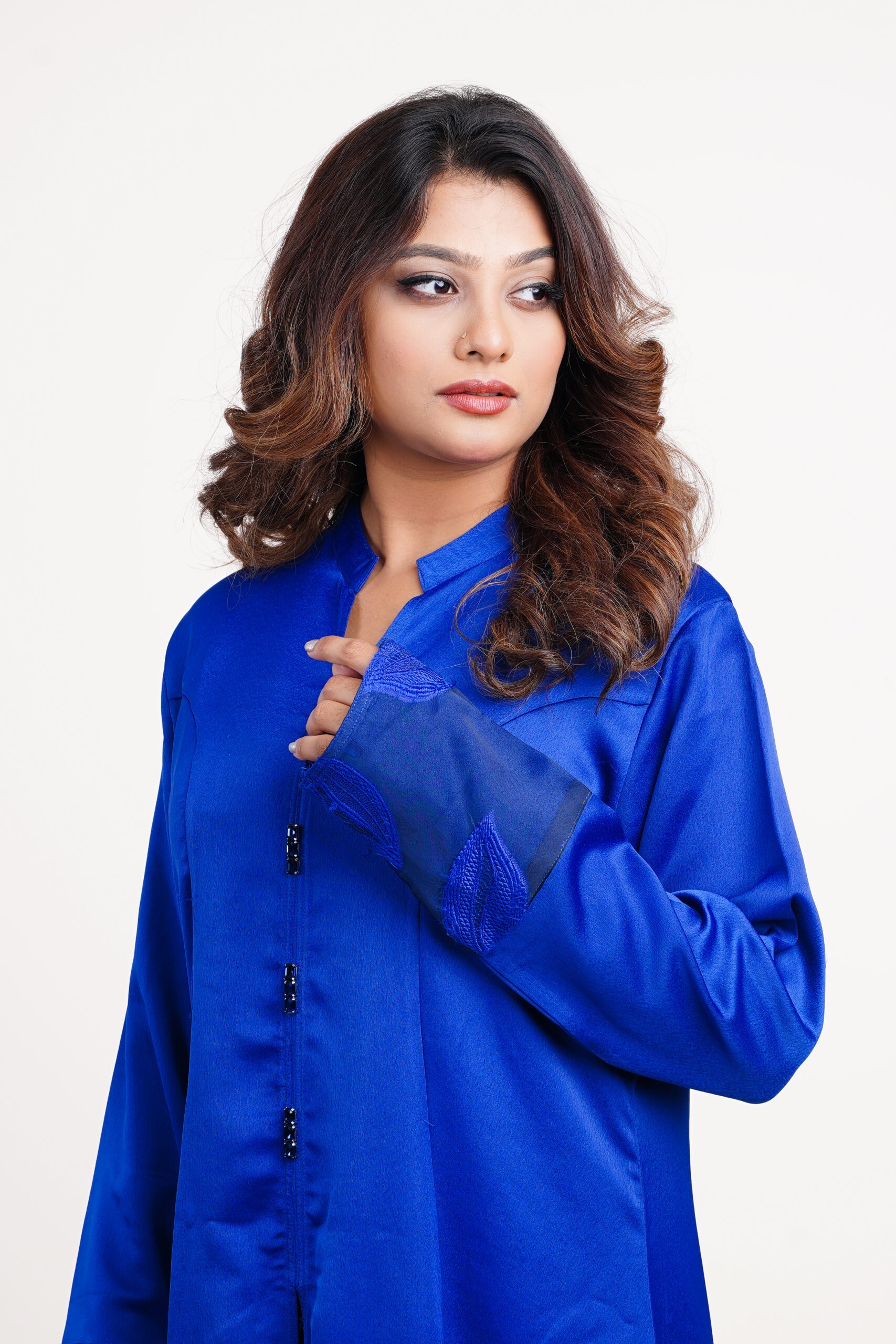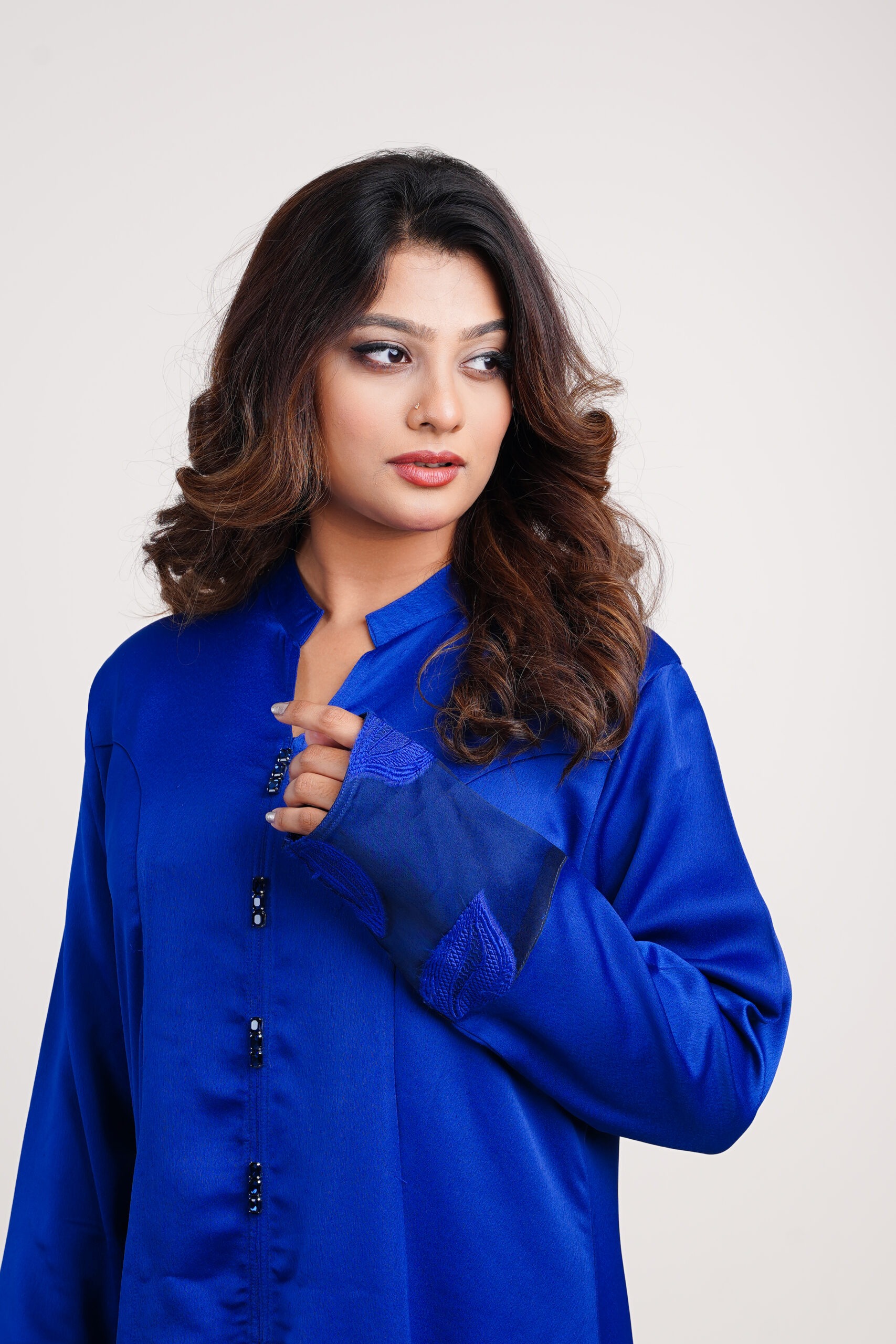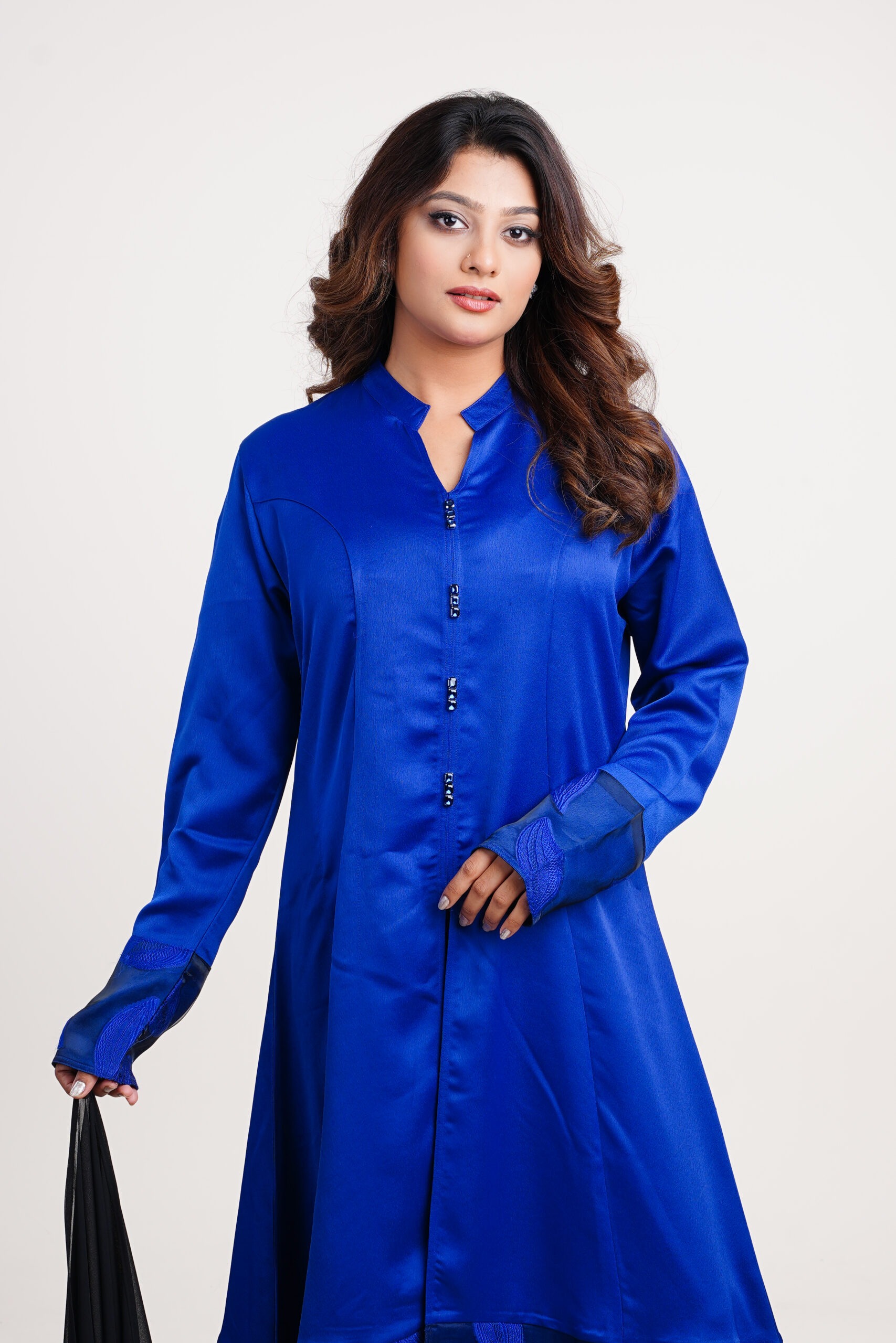 Full-length sleeves are styled with coordinated sheer cuff accents, adding sophistication and continuity to the overall design. The kurti is paired with matching straight-cut pants in royal blue Arabian silk, ensuring comfort and a clean silhouette throughout wear.