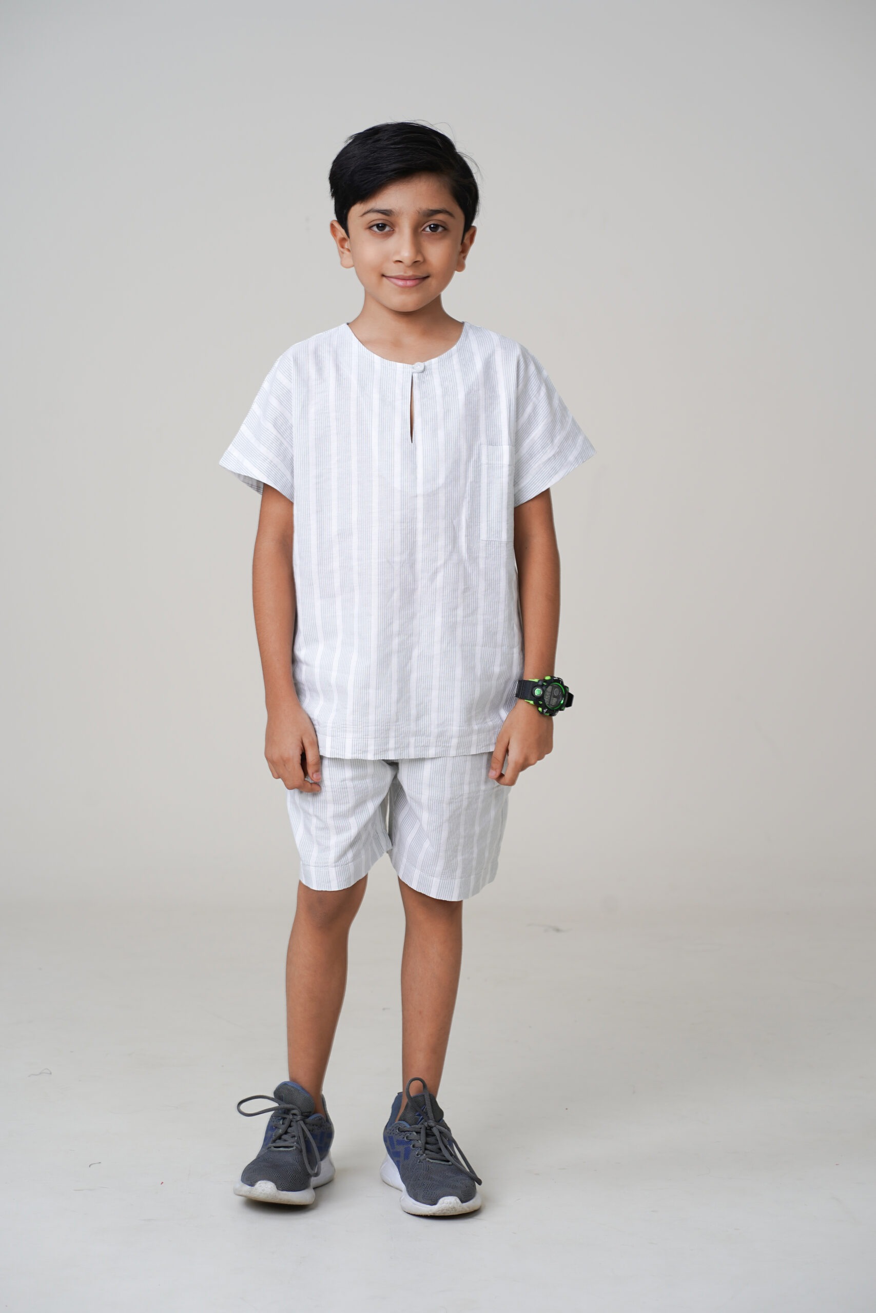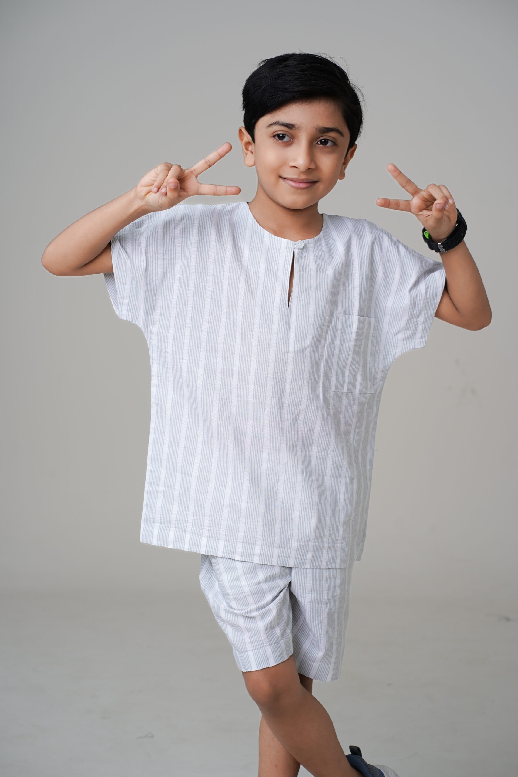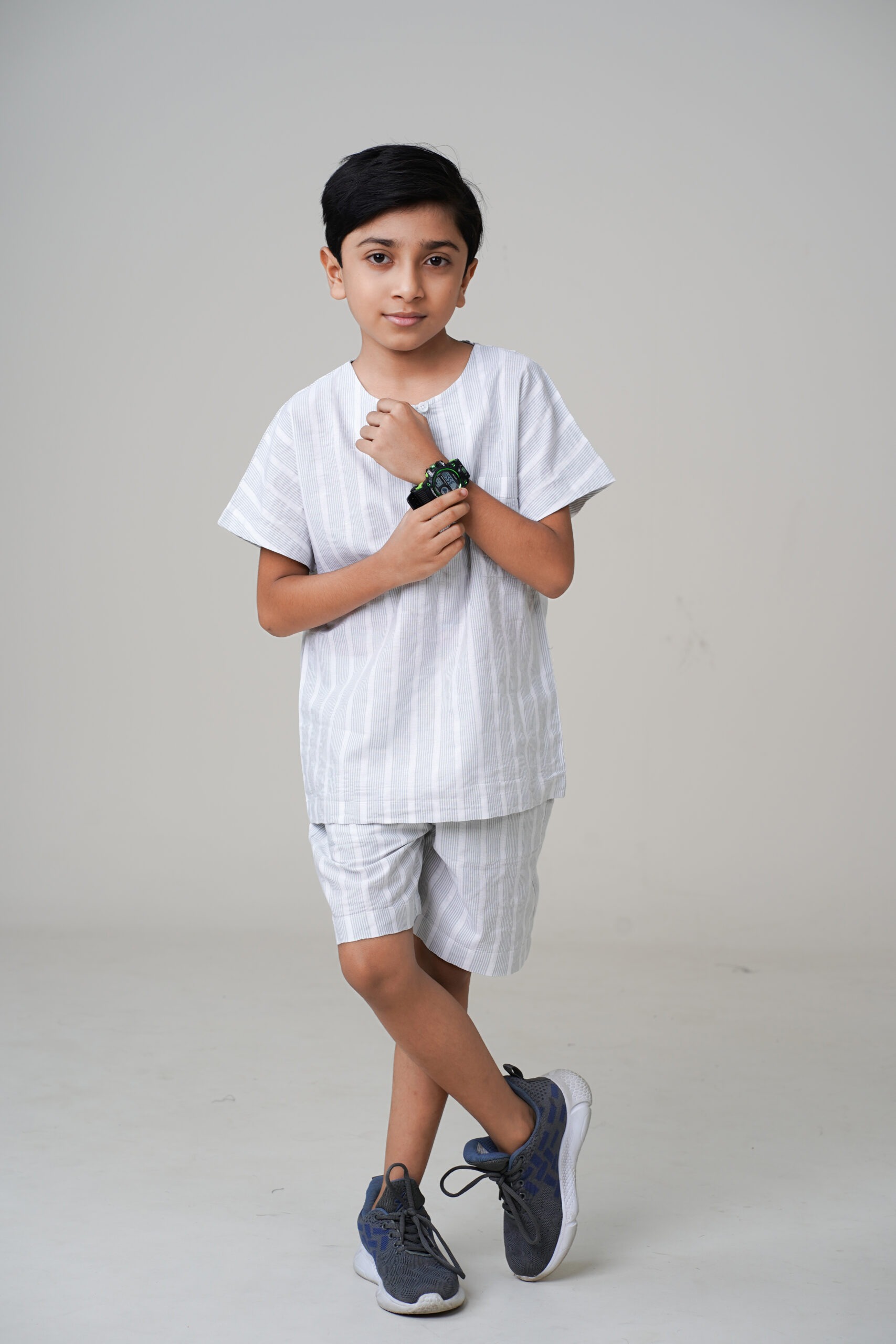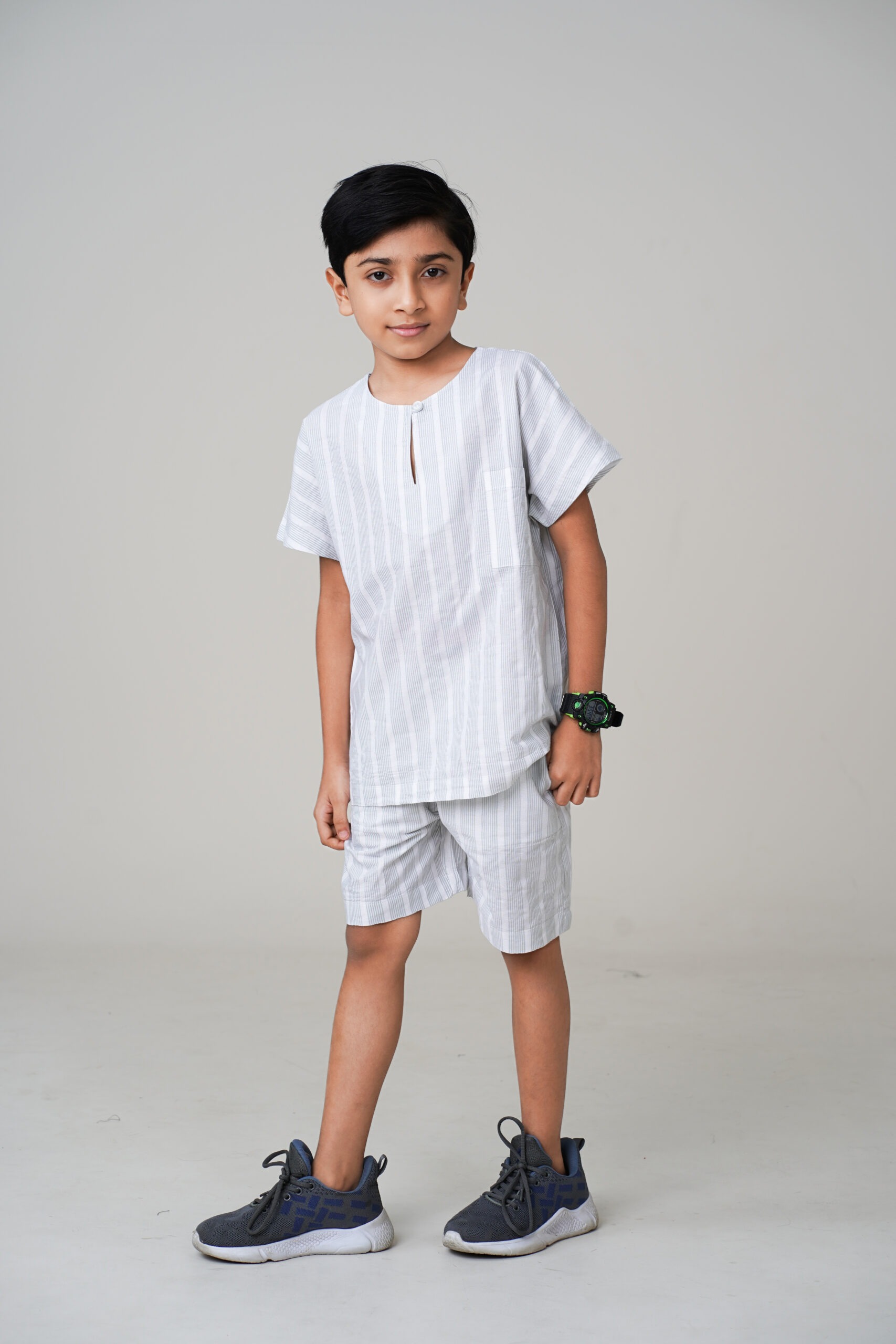 Crafted from soft, breathable cotton-blend fabric with a clean grey striped pattern, this fotua set brings a modern, relaxed look that’s ideal for school, weekends, park visits, vacations, and family outings. The airy short-sleeve top with a keyhole button detail adds a touch of charm, while the elasticated shorts provide easy movement—perfect for energetic boys.