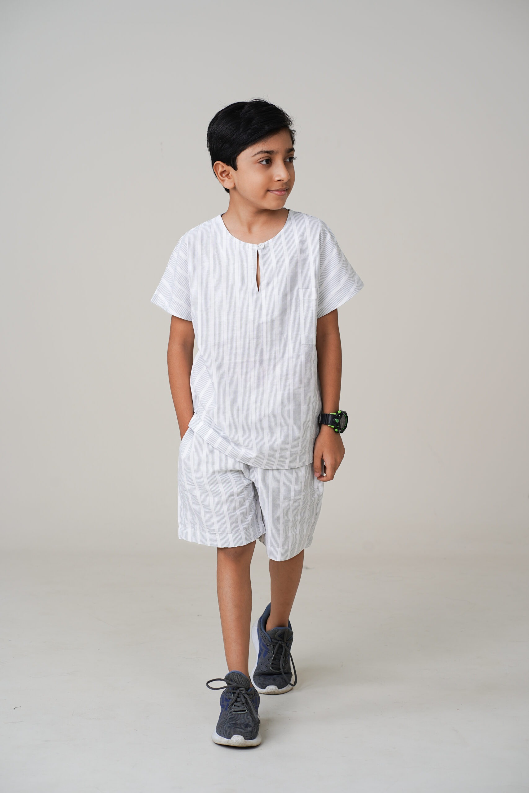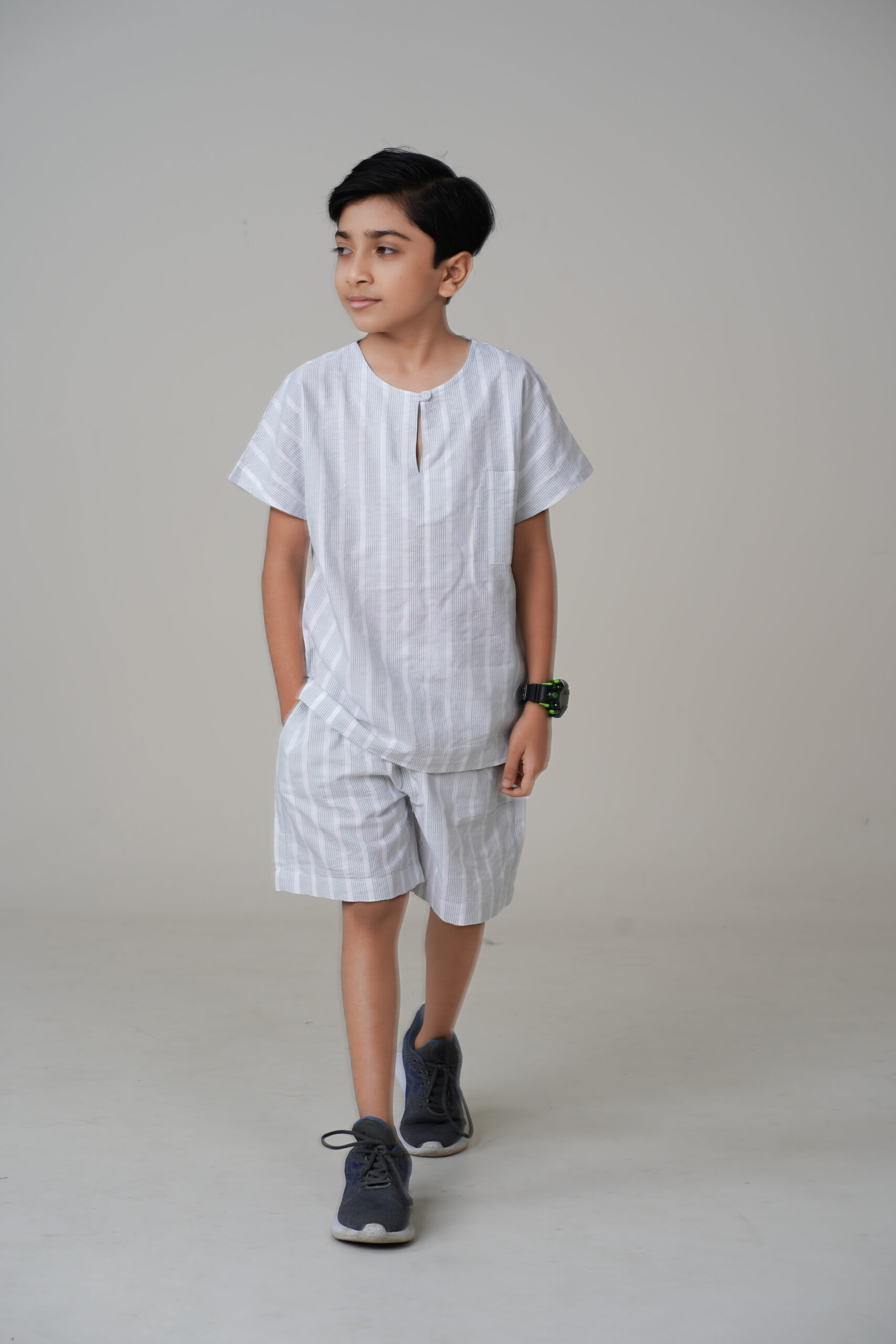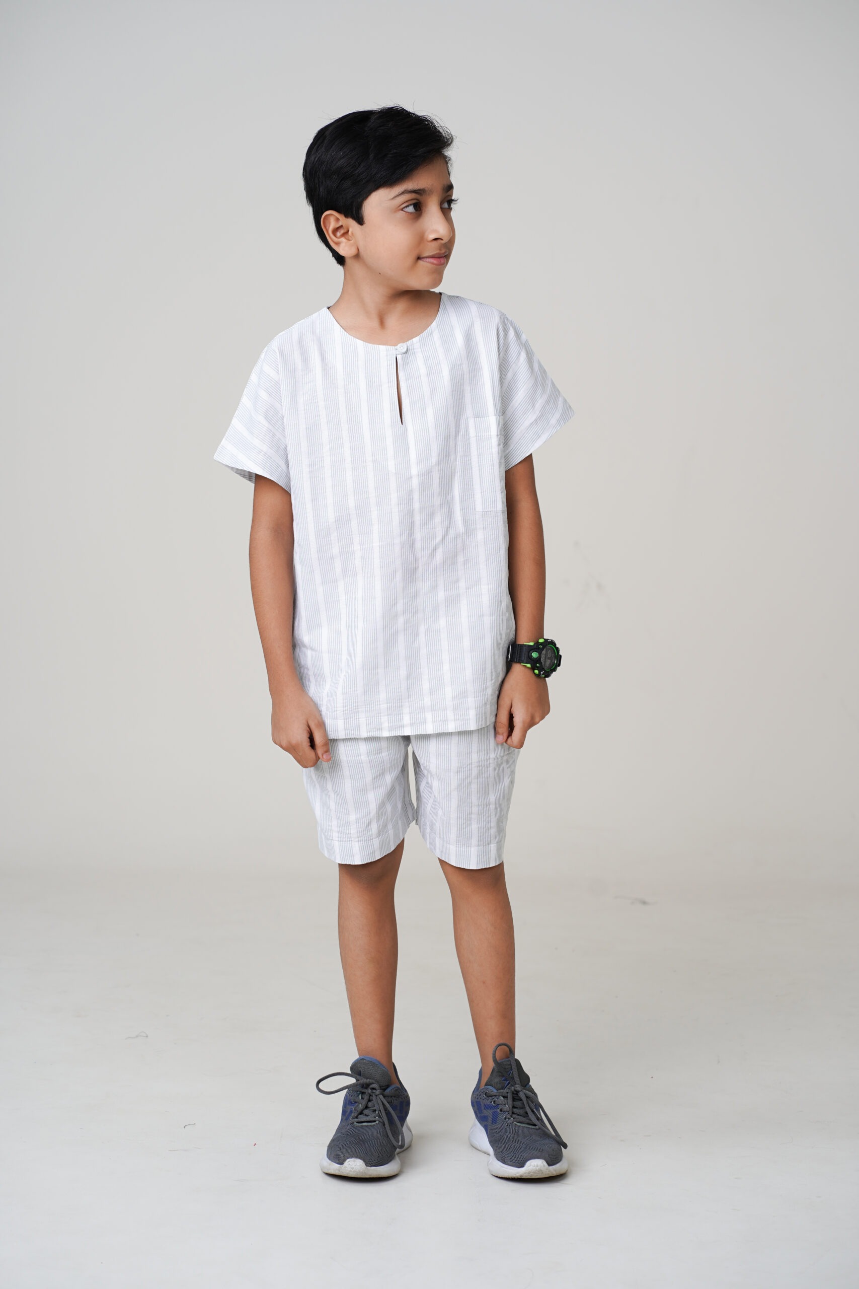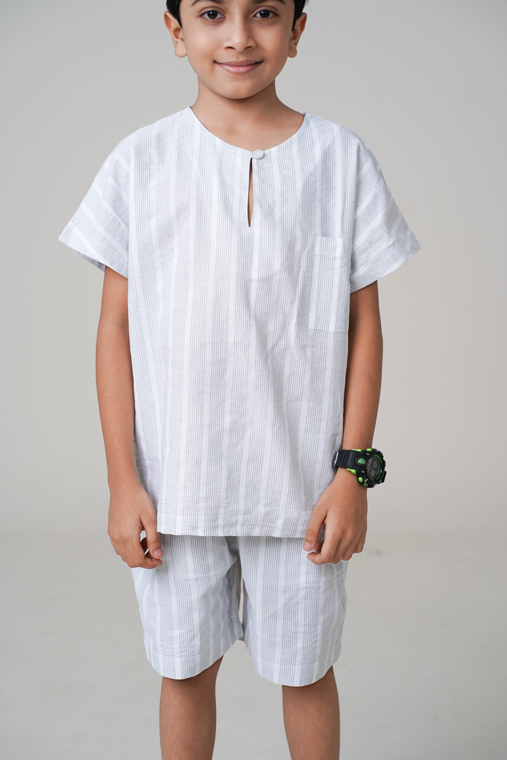 Crafted from soft, breathable cotton-blend fabric with a clean grey striped pattern, this fotua set brings a modern, relaxed look that’s ideal for school, weekends, park visits, vacations, and family outings. The airy short-sleeve top with a keyhole button detail adds a touch of charm, while the elasticated shorts provide easy movement—perfect for energetic boys.