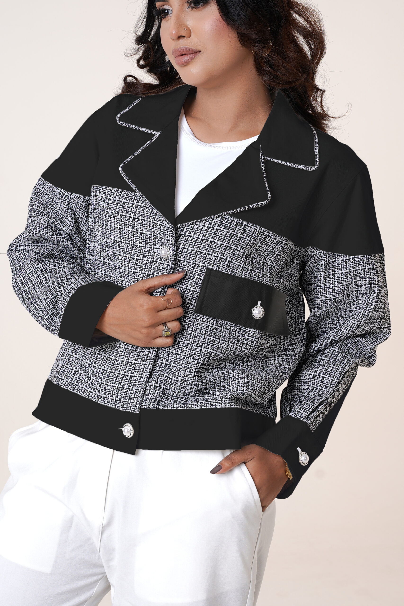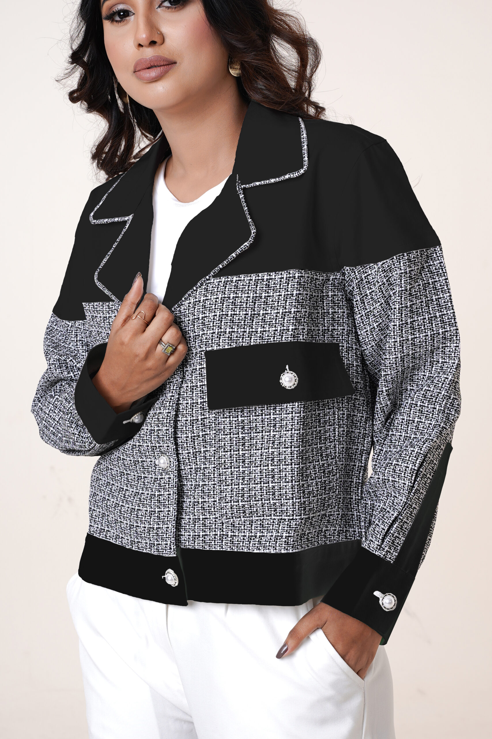Upgrade your wardrobe with this stunning Women’s Premium Black Tweed Jacket, crafted for modern style lovers who want elegance, comfort and versatility in one piece. The rich tweed texture pairs beautifully with the solid black contrast panels, creating a polished design that stands out effortlessly. The jacket features a structured collar, pearl button accents and refined piping that add a chic finishing touch to any outfit.