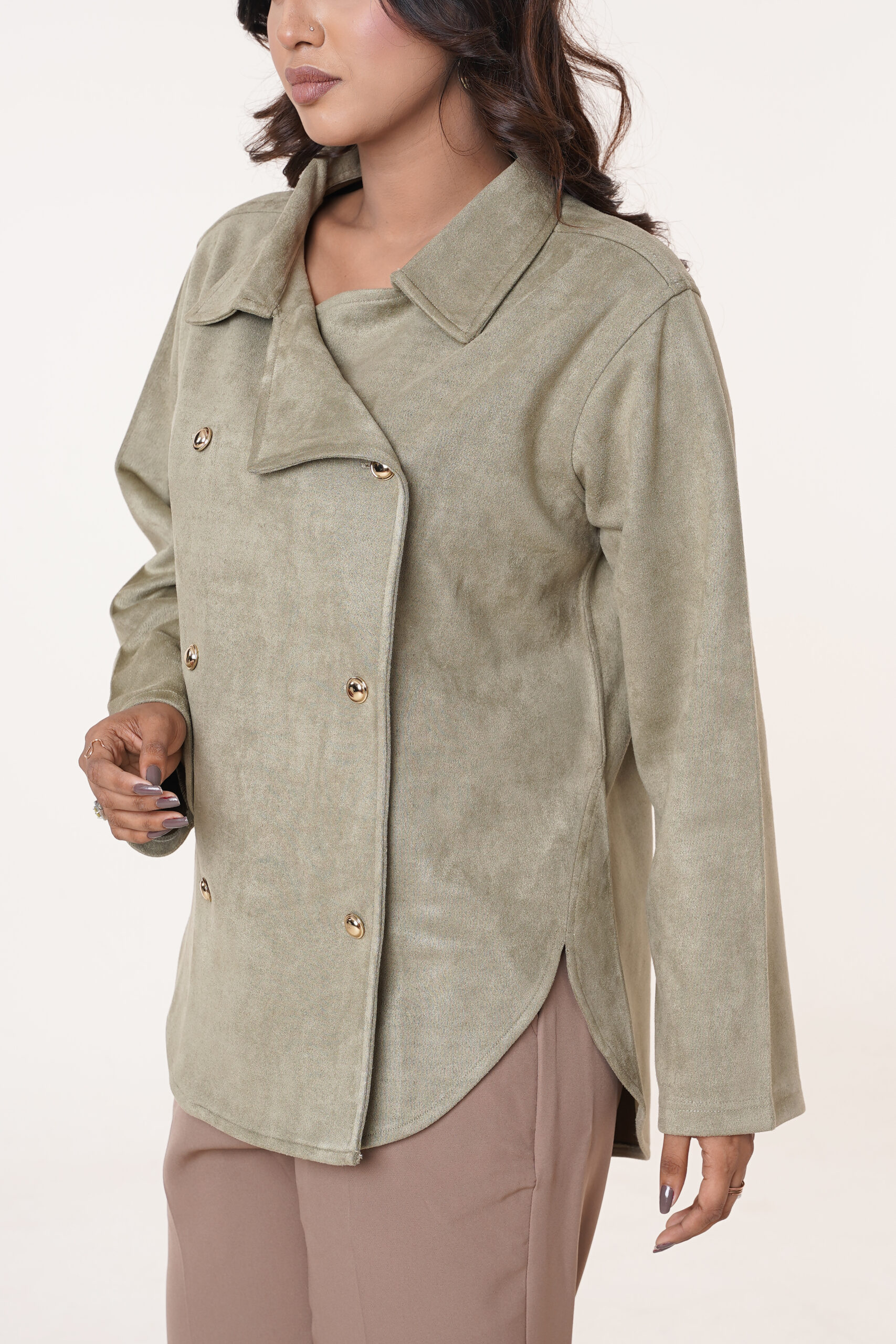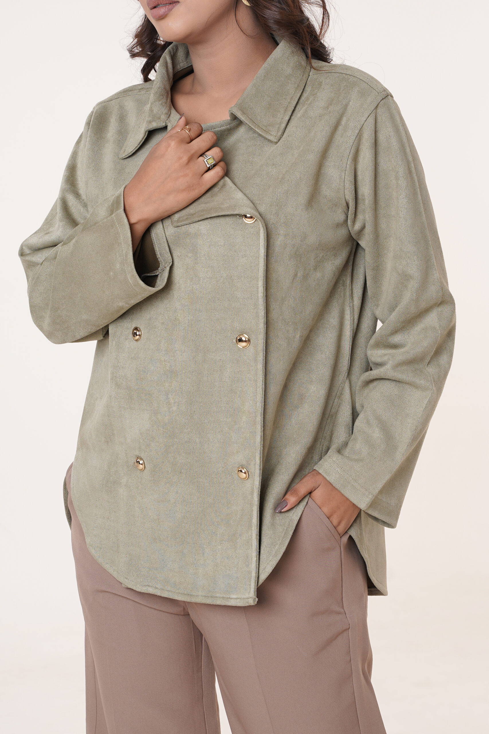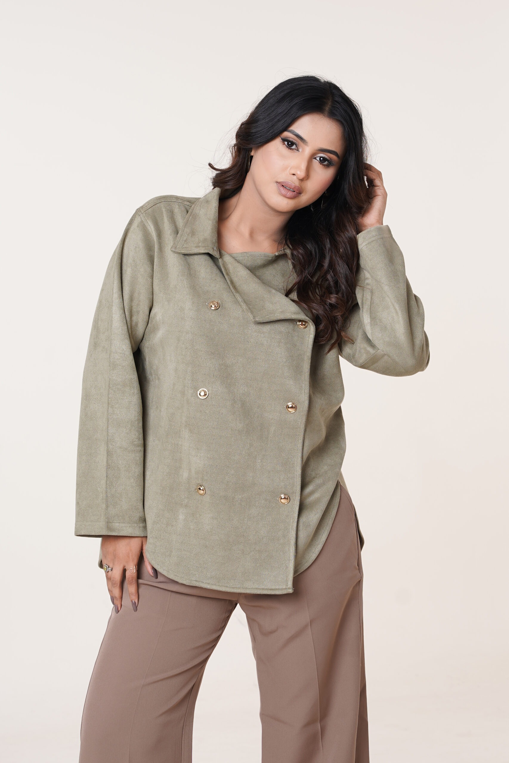 - Design: Double-breasted front, gold-tone buttons, smooth, relaxed structure